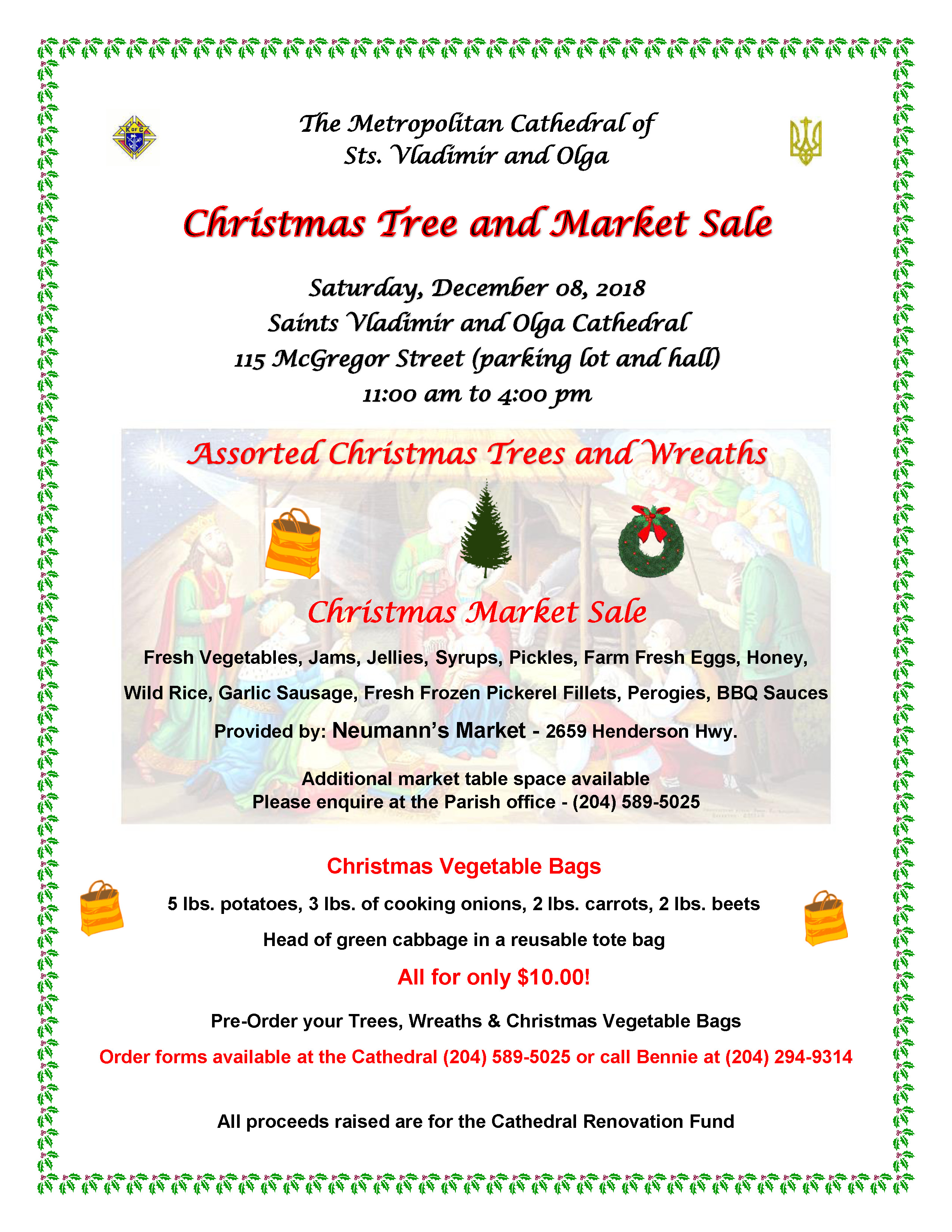 The Metropolitan Cathedral of Sts. Vladimir and Olga is having a Christmas Tree and Market Sale on December 8. Please see the picture for details. The information is also available on our Cathedral site http://www.stsvladimirandolgacathedral.ca/christmas-tree-and-market-sale/ Please pre-order your tree and vegetable bags. One of the things we’re promoting is for people to buy the $10 Christmas vegetable bags to donate to The Welcome Home, Siloam Mission, Winnipeg Harvest, or their favourite soup kitchen. We encourage people to pre-order the bags, trees and wreaths as quantities will be limited the day of the sale. We will deliver the bags to The Welcome Home if left with us. Charities helping charities. We still have room for additional vendors to rent a table and be part of the market in the hall. Please contact Bennie at 204-294-9314 or the Parish Office for details. The Cathedral is a Heritage building and one of Doors Open Winnipeg’s Hidden Gem award winners for multiple years. Tours will be available during the event.