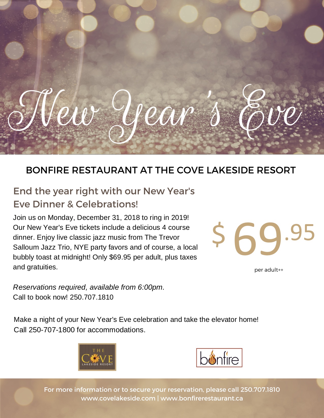 NEW YEARS EVE AT THE COVE LAKESIDE RESORT 4205 Gellatly Rd, West Kelowna, BC V4T 2K2 Join us on Monday, December 31, 2018 to ring in 2019! Our New Year’s Eve tickets include a delicious 4 course dinner. Enjoy live classic jazz music from The Trevor Salloum Jazz Trio, NYE party favours and of course, a local bubbly toast at midnight! Only $69.95 per adult, plus taxes and gratuities. Reservations required, available from 6:00pm. Call to book now! 250.707.1810 Make a night of your New Year’s Eve celebration and take the elevator home! Call 250-707-1800 for accommodations.