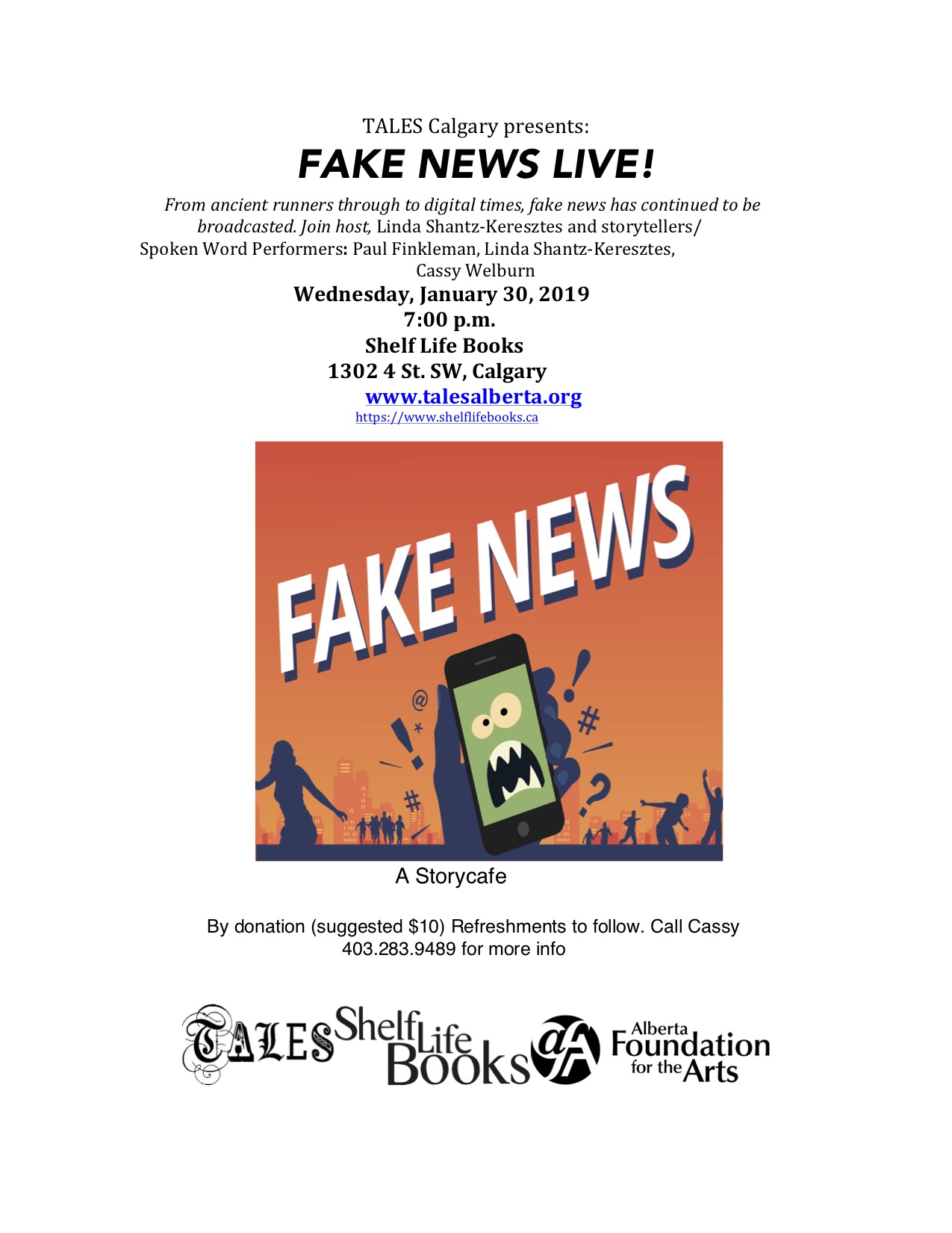 TALES presents, Fake News Live, a Storycafe, Wednesday, January 30th at ShelfLife Books, 1302 – 4 st. SW at 7:00 pm. From ancient runners through to digital , fake news has continued to be broadcasted. Join host, Linda Shantz-Keresztes and storytellers/Spoken Word Performers: Paul Finkleman and Cassy Welburn as they dazzle and disturb you with fake news through the ages. Can you spot the truth?