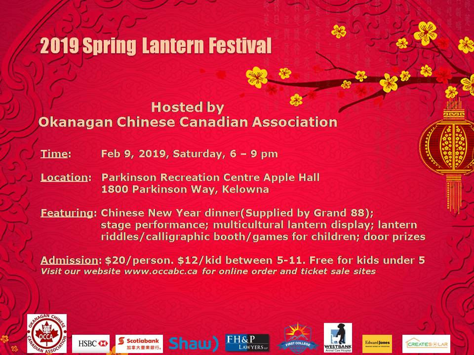 Featuring: Chinese New Year dinner(Supplied by Grand 88); stage performance; multicultural lantern display; lantern riddles/calligraphic booth/games for children; door prizes Admission: $20/person. $12/kid between 5-11. Free for kids under 5 Visit our website http://www.occabc.ca for online order and ticket sale sites