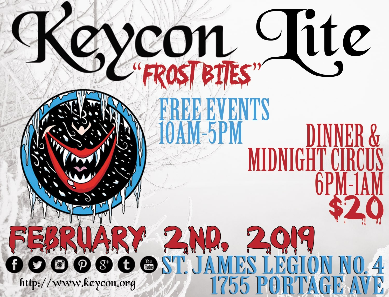 Keycon 36 presents:  Keycon Lite; Frost Bites! Now with Vampyres and all the creatures of the night! Saturday, February 2nd at 1755 Portage Ave, The St. James Legion No. 4. 10am to 5pm – FREE ADMISSION Love Keycon or never been? Our winter event, Keycon Lite, is the perfect place to find what lies in store later on at our main event in May! We will have gaming, panel discussions, the Keycon Marketplace, art show auction and so much more. 6pm – Dinner, 7pm – Midnight Circus.  Dance the night away with the vampyres, werewolves and creatures of the night.  With special fun and fortune involving the Vampire the Masquerade community.  (In honour of our May Guest Mark Rein-Hagan and the 200th anniversary since the first printing of the book “The Vampyre”).  There will also be raffle prizes available to be won! Dinner and dance tickets found here http://www.keycon.org/36/keycon-lite-frost-bites/