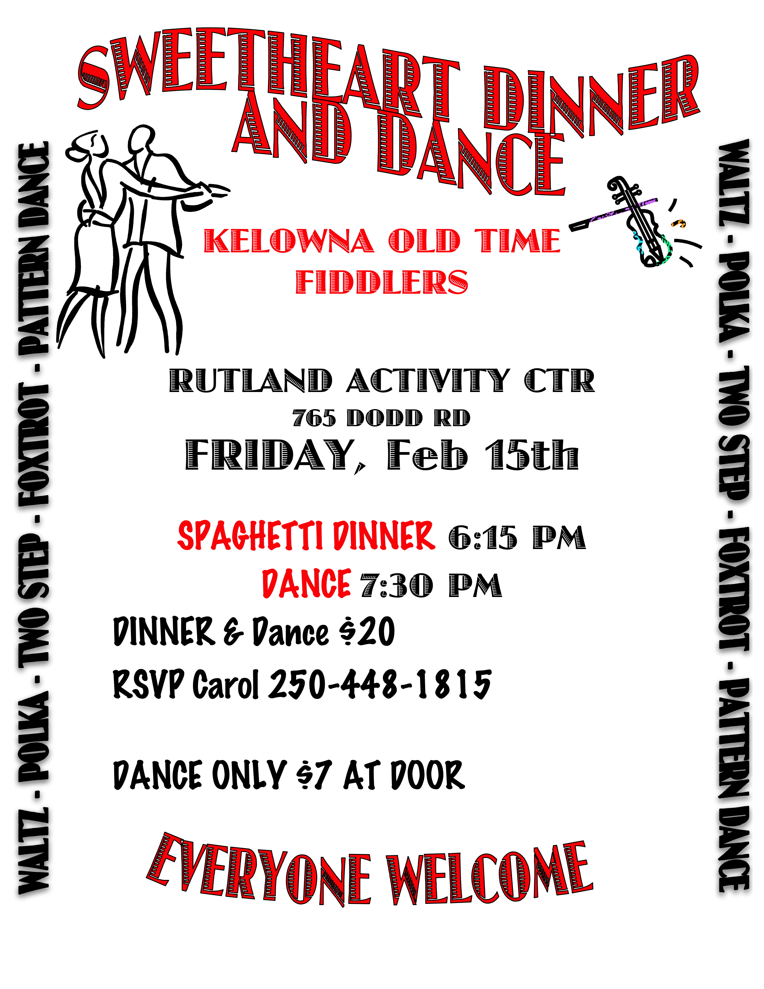 Enjoy a Spaghetti and Rib dinner followed by a dance at Rutland Activity Centre, 765 Dodd Rd. RSVP Dinner/Dance – call Carol 250 448-1815, Tickets $20. Dinner 6:15PM 7:30 PM Dance only $7 at the Door Live music by Kelowna Old Time Fiddlers