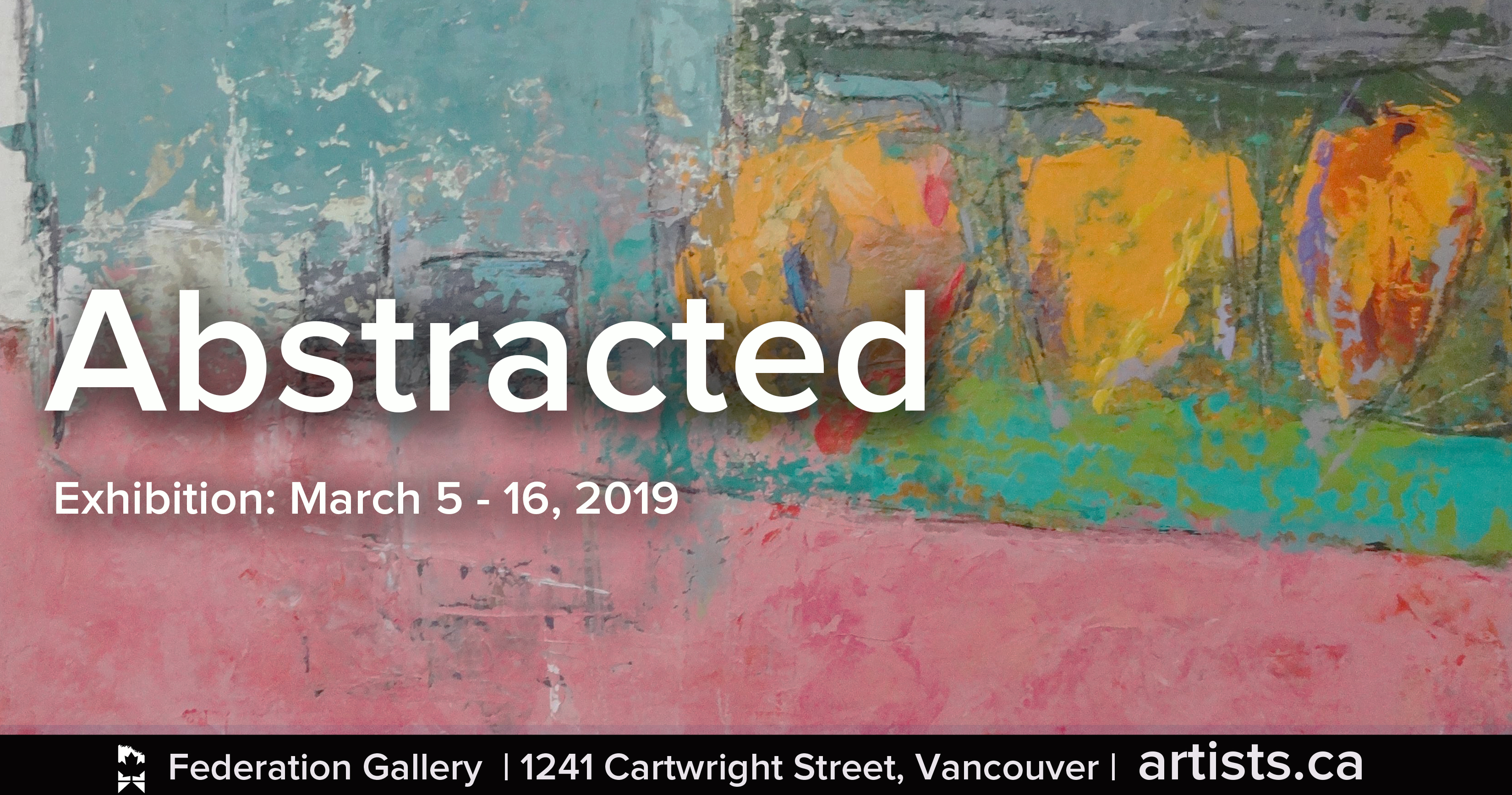 Abstracted Exhibition March 5 – 16, 2019 Featuring 55 Canadian artists, “Abstracted” will exhibit the full range of abstracted works. It includes artwork that takes inspiration from the light abstractions contained in Impressionism all the way to the large-scale abstractions of Expressionists. The Federation will exhibit both, and everything in between for a colossal collection of all things “Abstracted”. Federation Gallery, 1241 Cartwright Street Vancouver BC, V6H 4B7 For more information, please visit: http://www.https://artists.ca/ The Federation of Canadian Artists is a registered charity founded in 1941 by professional Canadian working artists including Group of Seven luminaries Lawren Harris, Arthur Lismer, and A.Y. Jackson. Comprised of over 2,800 members, the FCA displays a new exhibition every two weeks, and offers educational opportunities to emerging and established artists.