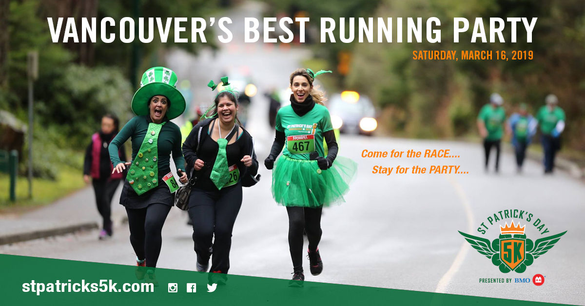 Join us at Vancouver’s Best Running Party! Register for the 14th annual BMO St. Patrick’s Day 5k in support of Diabetes Canada and put a little Irish in your step on Saturday, March 16, 2019. Dress up in green and chase Ferrari Maserati of Vancouver’s pace car around a scenic 5k loop of Stanley Park. Runners will receive a 2019 souvenir Stanley Park Brewing beer glass when they cross the finish line. After the race enjoy Irish stew, beer, dancing and prizes for costume contest and more. The BMO St. Patrick’s Day 5k is the premier 5k running event in Canada and is also partnered with the BC Super Series and the Lower Mainland Road Race Series. Come for the Race…Stay for the Party…