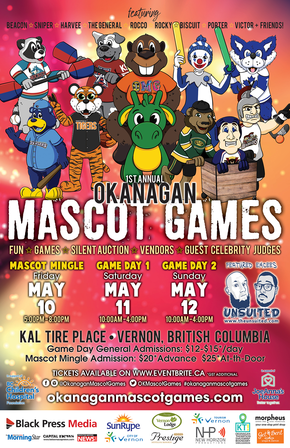 The Okanagan Mascot Games bring some of your favourite mascots head to head in challenging battles to see who will come out the ultimate champion! Mascot Week ends with a VIP Mascot Mingle on May 10, 2019 where you can meet and greet your favourite mascots, catch some fist bumps, high fives and hugs along with photos to last a lifetime! Next up May 11-12, 2019 the games start and the mascots form teams challenging each other to win the ultimate glory of Mascot Champion! Join a cheering squad and cheer on a team headed by a local mascot as your cheer captain. The ultimate fun for the whole family! Partial proceeds from ticket sales will be divided between BC Children’s Hospital and JoeAnna’s House (KGH Foundation). There will also be a silent auction on the concourse that the funds raised will be divided evenly between are two main initiatives! Promoting and giving back to our communities is what we do and we are so proud to be giving back to 2 organizations that initiatives give support and help to many families in our region.