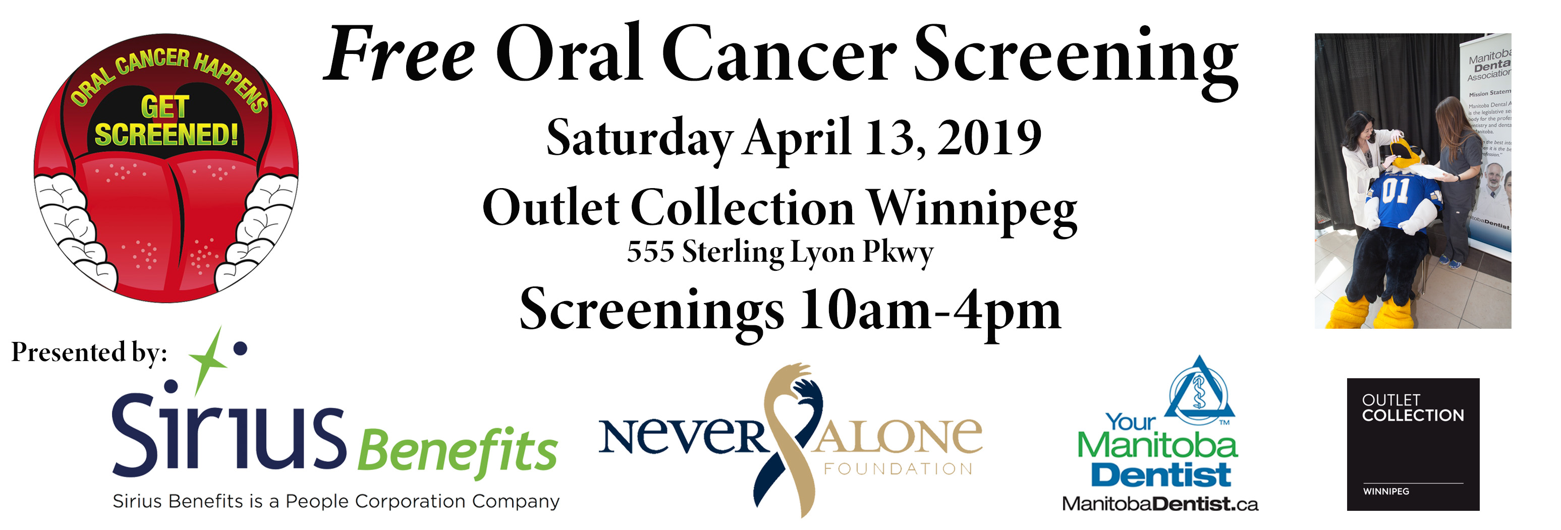 Oral Cancer is on the rise, particularly among young, healthy, non-smokers. Awareness of Oral Cancer is NOT increasing. But, it needs to. Never Alone Foundation is holding a Free Oral Cancer Screening event on Saturday, April 13, 10am to 4pm at Outlet Collection Winnipeg. Exams are fast, private, and performed by Oral Health Professionals. Five Minutes Can Save Your Life.