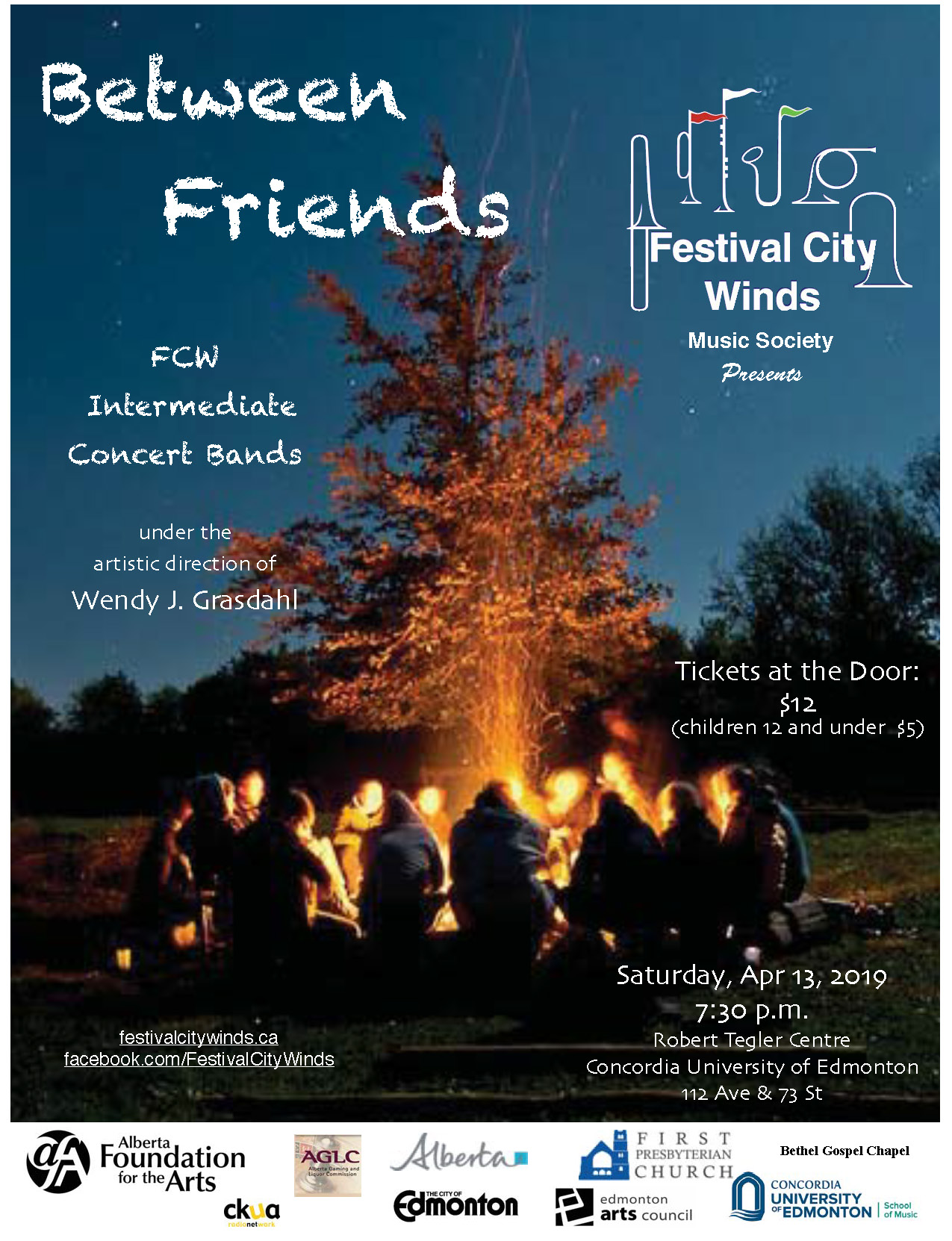 Festival City Winds Music Society Intermediate Bands Celebrate Friendship Both Festival City Winds Intermediate Bands, under the direction of Artistic Director Wendy J. Grasdahl, are pleased to celebrate friendship with a concert entitled Between Friends on Saturday, April 13, 2019 at 7:30 PM in the Robert Tegler Centre, Concordia University of Edmonton (7128 Ada Boulevard – 73 St. south of 112 Ave.). The evening will be full of marches, folk songs, lullabies, and music based on travel experiences – all things that might be experience and shared Between Friends. The Intermediate Two Band will explore music from the British Isles (Green Bushes, Deir’ In De, and Suite for Band), including Artistic Director Wendy J. Grasdahl’s ancestral home of Wales (Welsh Folk Fantasy), as well as music capturing the mystery and grandeur of the ancient Han Dynasty empire with The Temple of Guan Yu. The Intermediate One Band will transport the audience to picturesque New England, follow new immigrants as they arrive on Ellis Island (Isle of Hope, Isle of Tears), experience two dogs frolicking in the yard (That Old Hound Dog Rag), and reflect with the melancholy Beatles ballad Yesterday. The evening concludes with both bands coming together to perform Larry Daehn’s A Song for Friends. Come celebrate friendship with Festival City Winds! Tickets for Between Friends are $12 for Adults and $5 for Children (12 & Under), and can be purchased at the door.