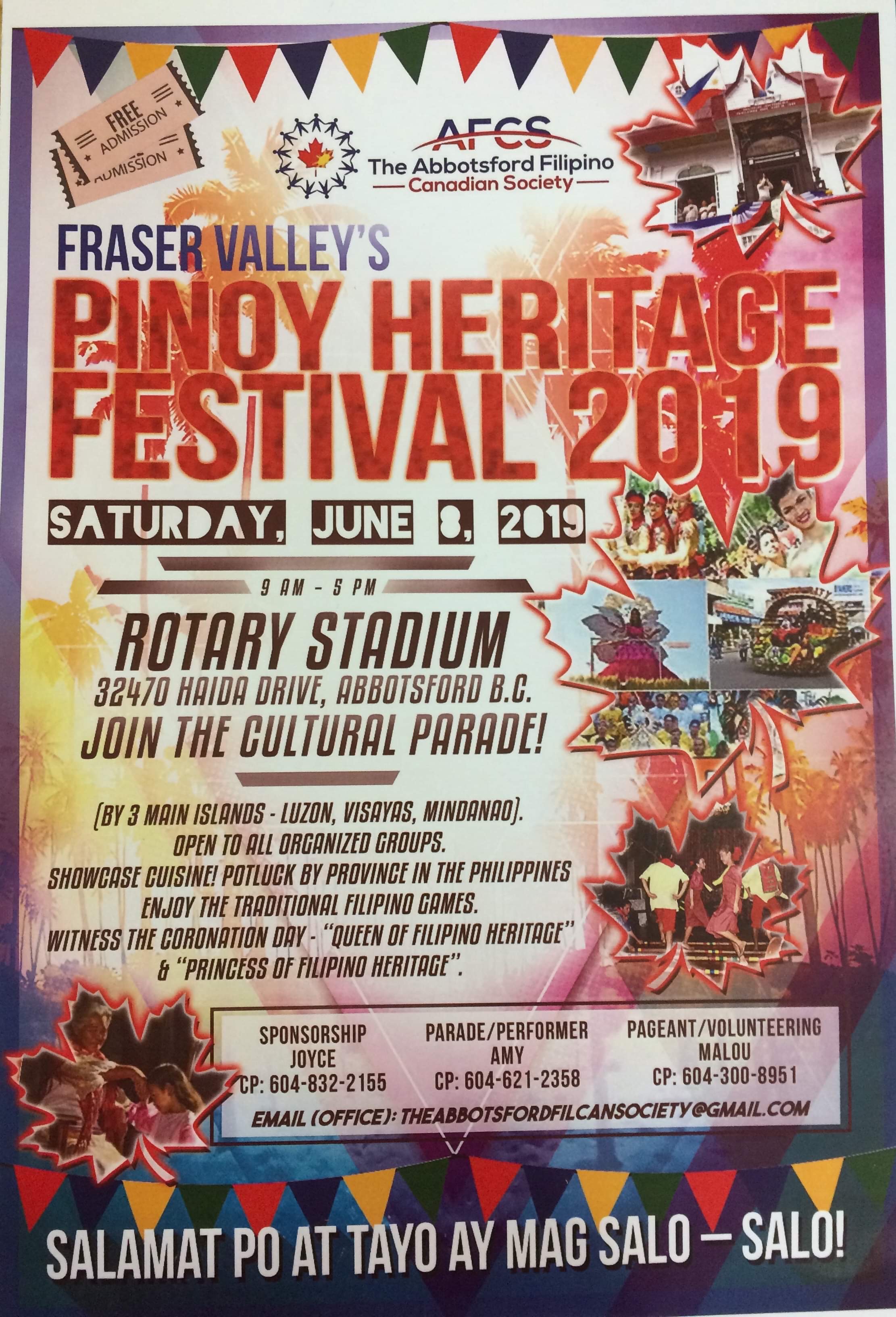 The Abbotsford Filipino Canadian Society is holding a Filipino Heritage Month in the Fraser Valley in June 8,2019.There will lots of family fun cultural parade, showcase of Filipino cuisines, traditional games, crowning of Queen and Princess of Filipino Heritage and lots more. This is a family fun affair that you will enjoy and celebrate Filipino Culture in the FraserValley