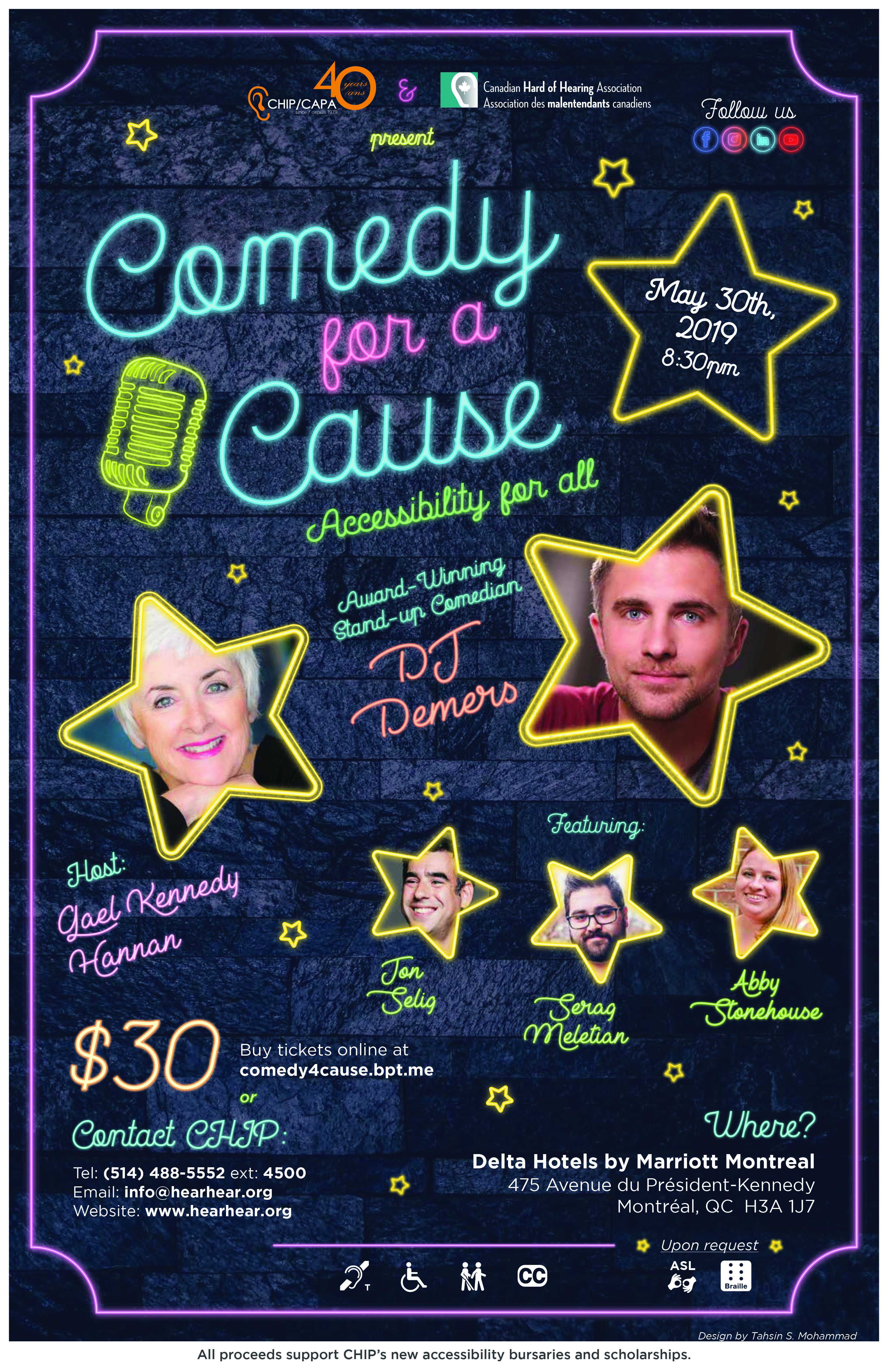 CHIP/CAPA will be hosting a special Comedy for a Cause fundraiser. In honor of national accessibility week. This first-time-ever, one-of-a-kind stand-up comedy extravaganza features award-winning comedian DJ Demers of America’s Got Talent, Conan, and Just For Laughs fame. Hosted by actor, humorist, and disability-rights activist Gael Hannan, and featuring local talents Jon Selig, Serag Meletian, and CHIP’s own Abby Stonehouse, the evening promises serious laughs! Best of all, this event is fully accessible to people with low mobility, vision, and/or hearing, and all proceeds go towards CHIPs new scholarships and bursaries supporting accessibility. Accessibility measures include closed captioning, T-Loop, full wheelchair access, and sighted guides for people with low vision. ASL interpretation is available upon request by May 15th, and braille (paper) tickets are also available upon request. Date and Time: May 30th 2019 – Doors open at 8pm shows starts at 8:30pm Location: Delta Hotel 475 Avenue du Président-Kennedy, Montréal, QC H3A 1J7 Tickets cost: 30$ (paper and online ticket sale)