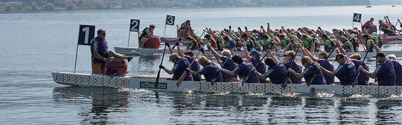 Our festival, held over two days on the second weekend in September, is entering its 19th year. The dragon boat racing happens on Skaha Lake. Alongside the action-packed racing, the event also features a beverage garden, a wide range of vendors, lots of great food and over 2,500 athletes. Proceeds from the beverage garden will be going to Survivorship – The South Okanagan’s Breast Cancer Survivor Dragon Boat Team. The racing consists of two 500 m qualifying heats on Saturday, followed by semis Sunday morning, and finals Sunday afternoon. The races are visible for the entire 500 m course. We invite you to join us!