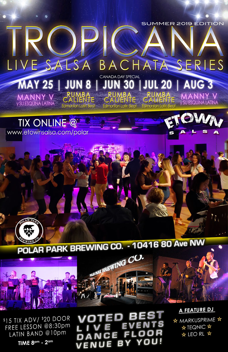 Aventura was our Winter 2019 edition of the ever popular Live Salsa Bachata Series introduced new for 2019 and only because you all wanted more, we bring it BACK!! This time its called TROPICANA Live Salsa Bachata Series Summer 2019 edition. This will feature 2 Latin bands namely Manny Valencia y Su Esquina Latina and Remo Priolo’s Rumba Caliente! In addition, each night will also feature 1 DJ to play a mix of Salsa, Bachata and Kizomba music. Doors open at 8pm and the night will start off @ 8:30pm with a beginner to intermediate lesson in Salsa & Bachata! Band will start at 10pm. This is a great date night and even better for singles where you will see many immersed in the Latin dance culture of asking others to dance. After talking to many of you, you loved the venue for its combination of central location, amazing hardwood floor, cool ambiance, and size of dance floor. Polar Park is not only located in the heart of nightlife central but its very convenient for many that already live near the brewery. Its also a beautiful venue that has a 2nd floor LIVE EVENT section of the building that is 5000 sq ft with a full stage for bands, lighting and state of the art sound system designed for LIVE Events! Not only is it great for LIVE events, but for dancers, its a DREAM! Full hardwood floor that has everyone saying WOW! For dancers to have a Saturday night in a club environment is PERFECT! But when you have a live event plus a gorgeous dance floor, all the stars have lined up and you can’t expect any place better for this. But come see for yourself , an average of 200 guests came to the first 4 events and have definitely been convinced so we expect a better turnout for this summer series!! LIVE EVENT DATES : May 25 – MANNY V y SU ESQUINA LATINA June 8 – RUMBA CALIENTE June 30 – RUMBA CALIENTE ( CANADA DAY SPECIAL) July 20 – RUMBA CALIENTE Aug 3 – MANNY V y SU ESQUINA LATINA