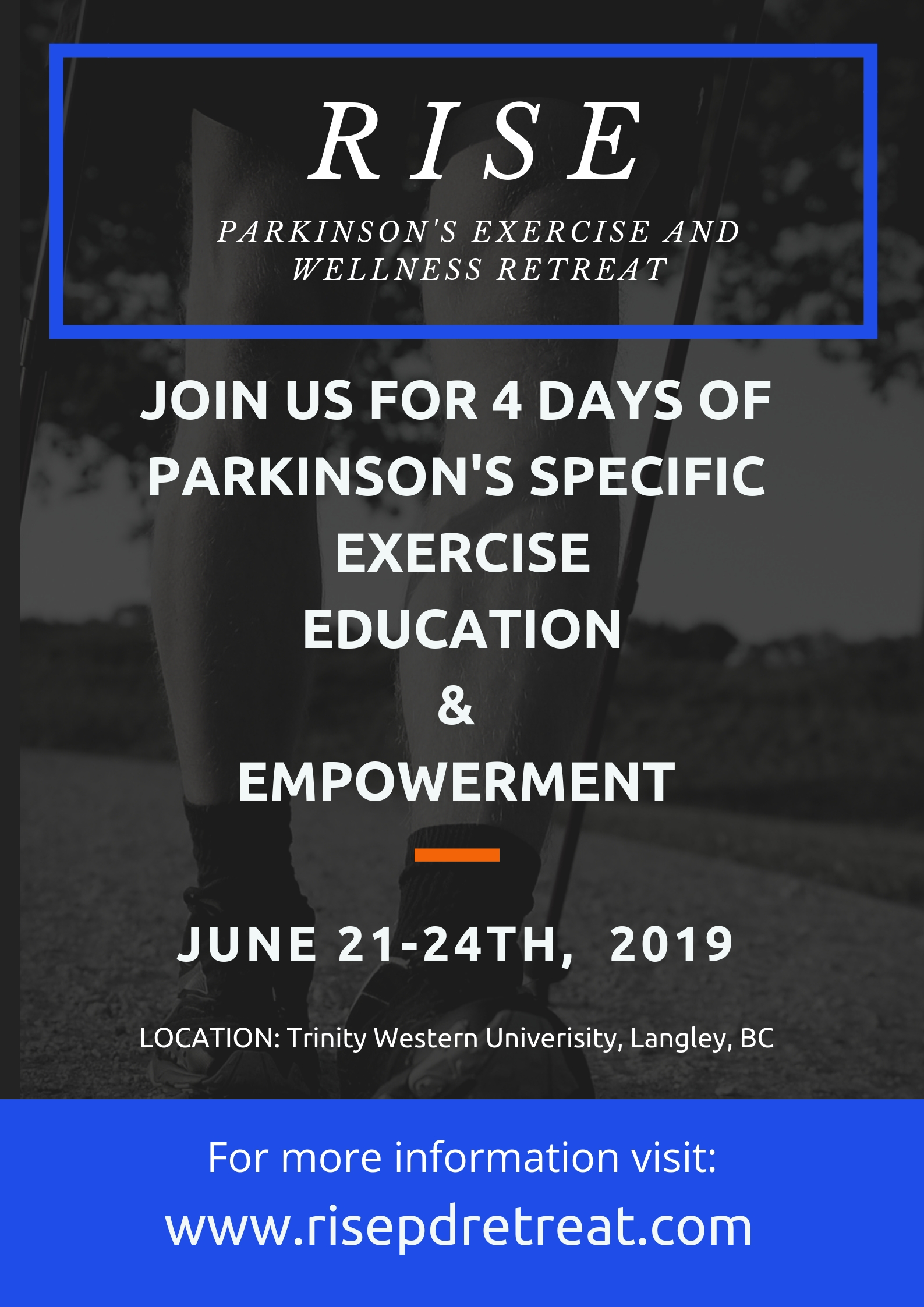 RISE is Canada’s only retreat focused on exercise, education and empowerment for those living with Parkinson’s Disease and their families/carers. This retreat is run by Physiotherapists with clinical expertise and experience specifically in treating Parkinson’s Disease (Naomi Casiro & Natasha Wilch). It will take place over 4 days and includes talks & seminars by movement disorder specialists, yoga instructors, physiotherapists and more. Connect with a fantastic community of experts and peers, and intensity your exercise regime, and improve your PD symptoms!