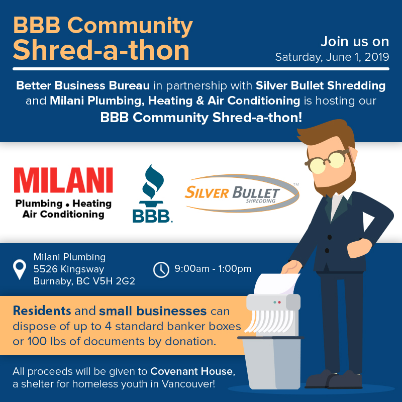 The BBB Community Shred-a-thon is coming up! Join us on Saturday, June 1, 2019 from 9 am – 1 pm at Milani Plumbing, Drainage & Heating on Kingsway in Burnaby! Silver Bullet Shredding will be on spot to help you dispose of your confidential documents safely! All proceeds from your donations will be given to Covenant House Vancouver! Spread the word and let’s shred for a cause!