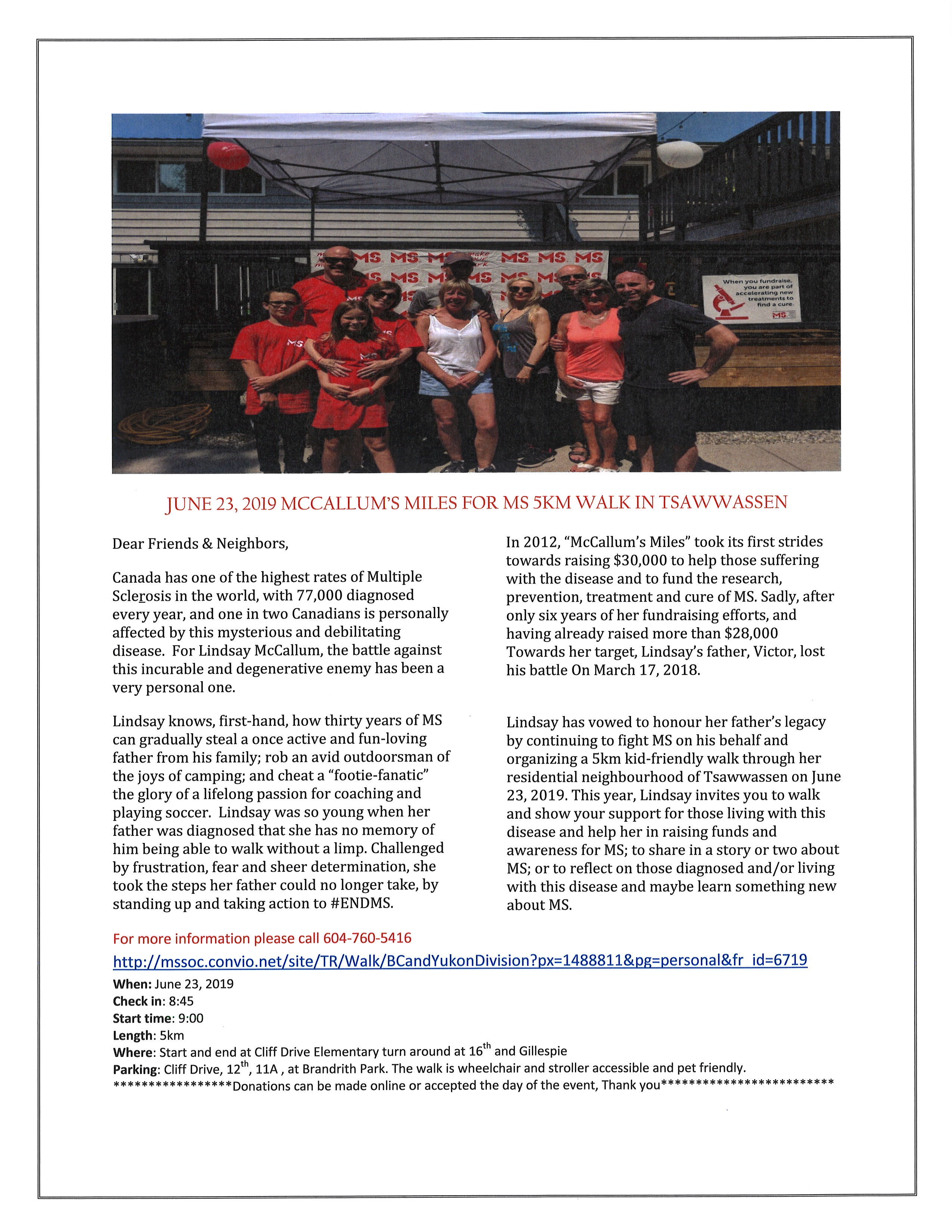 Your invited to the 7th Annual McCallum’s Miles for MS Fundraiser on June 23rd – 5 km walk in Delta. Let’s work together and end MS