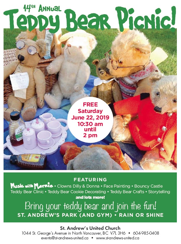 Grab your favourite teddy bear and join in the fun! St. Andrew’s United Church invites the public to attend its annual Teddy Bear Picnic on Saturday, June 22nd from 10:30 am – 2 pm, rain or shine, at St. Andrew’s Park .The event is free and features a variety of entertainment for everyone including Music with Marnie, clowns Dilly & Donna, face-painting by Looking Glass face painters, Jump for Joy bouncy castle, and the ever popular Teddy Bear Clinic, Teddy Bear cookie decorating, arts and crafts, storytelling, concession stand, and much more! Everyone welcome! Info: 604-985-0408 / events@st-andrews-united.ca / http://www.st-andrews-united.ca