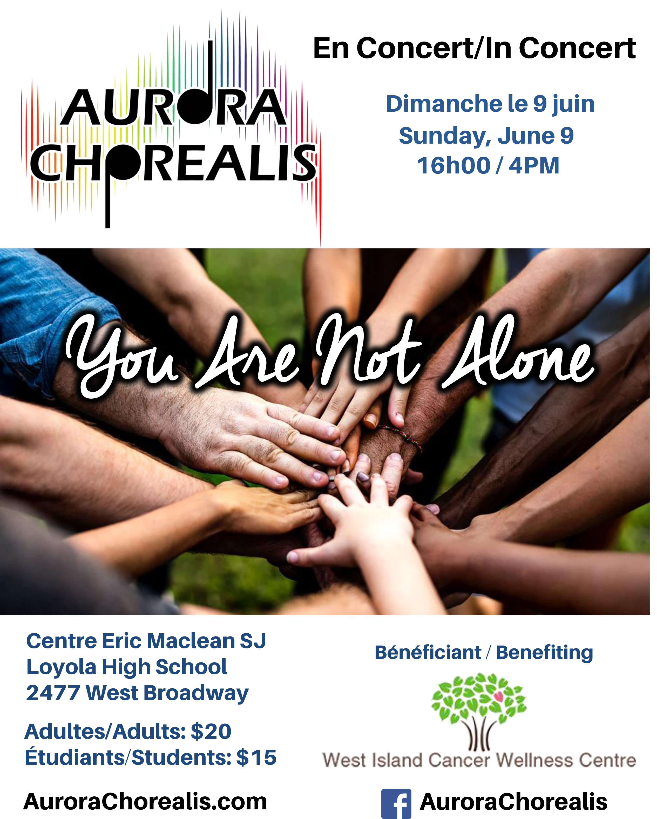 We are pleased to invite you to an outstanding afternoon riding the colorful sound waves of Aurora Chorealis as we present this year’s concert entitled “You Are Not Alone”. We’d be honored if you would join us on June 9th at 4PM at the Eric Maclean Center, Loyola High School. The show, under the direction of John Le Blanc, assisted by Anna Graham, will include a broad repertoire from a variety of musical genres – including Contemporary/Pop, Classical, World Music, Broadway, original composition, etc. There is something for everyone! The majority of the proceeds from this year’s concert will be donated to the West Island Cancer Wellness Center.