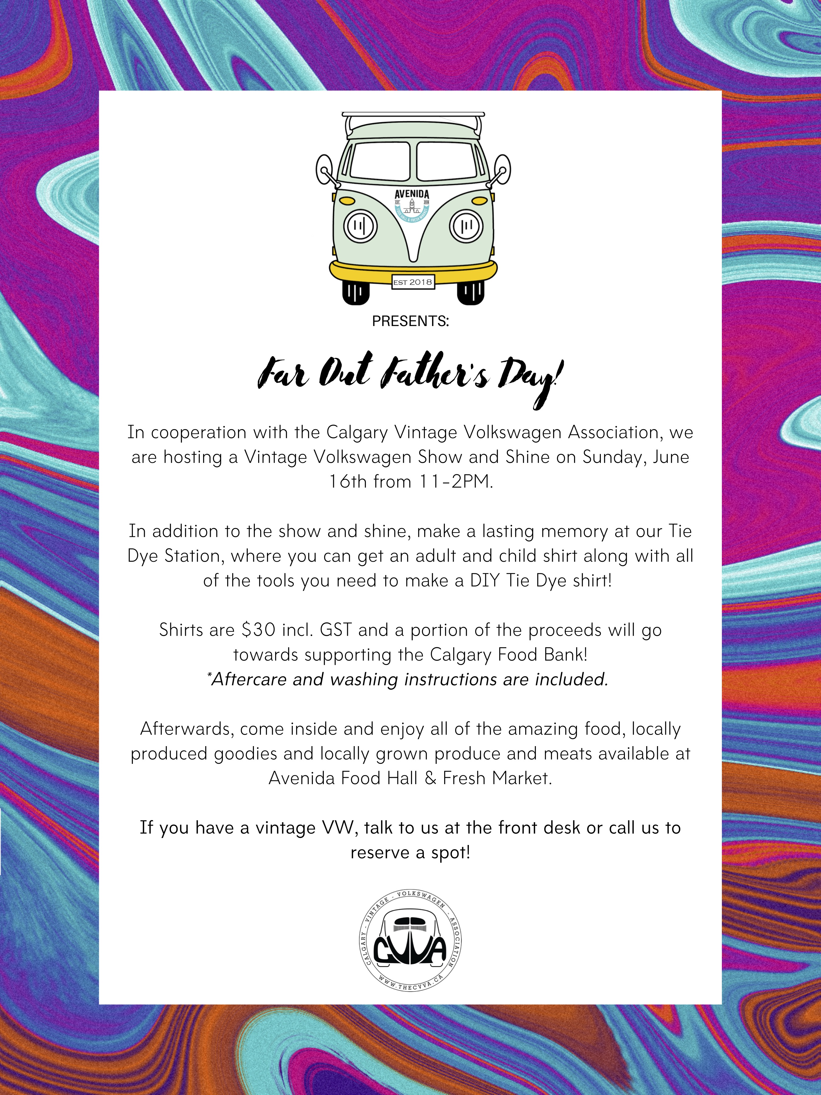 Join us at Avenida Food Hall for a far out Father’s Day! In cooperation with the Calgary Vintage Volkswagen Association, we will be hosting a Vintage Volkswagen Show and Shine on Sunday, June 16 from 11am-2pm. In addition to the show and shine, make a lasting memory at our Tie Dye Station, where you can get limited edition adult and child-sized shirts along with all of the tools you need to make a DIY tie dye shirt! Shirts are $30 and a portion of the proceeds will go towards supporting the Calgary Food Bank. After checking out the show and shine, come inside and enjoy all of the amazing food, local produce and artisan goods available at Avenida Food Hall.