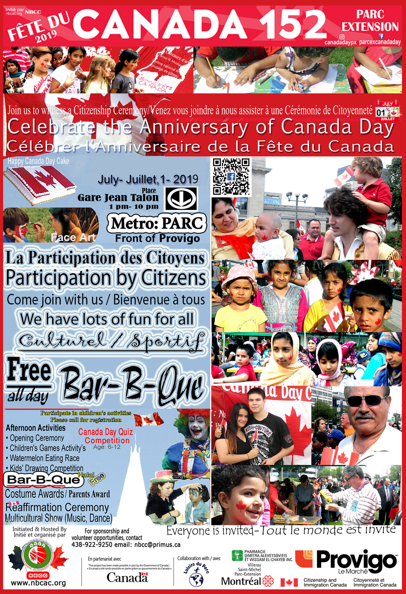 Come join us at the Canada Day Celebration in Parc-Ex Venez-vous joindre à nous lors de la Célébration de la Fête du Canada à Parc-Ex July 1st, 2019 (on Metro Parc) on the field of Provigo. From-12pm-10pm • #CanadaDay, #FêteduCanada As you know 2019 marks the 152nd of Canada Day Celebration. We are in the final planning stages of a larger than usual event by hosting a ‘Multicultural Festival” at Parc-Ex on July 1st Monday, 2019 at Place de la Gare Jean Talon Parc (Metro Parc). We are going bigger and better than ever before to make Canada’s 151st an event to be remembered! As a great community organizer, we are looking for your cooperation in this year’s great celebration. We can together make another historical event for the all the citizens of Canada. We will share Canadian values with new comers and our future generations living in Parc-Ex- Villeray -Saint Michel. Hosted by National Bangladeshi-Canadian Council (NBCC) and partnering with Government Canada and local community organizations, we are going to celebrate 152nd Canada Day with Citizenship Ceremony and cultural activities in presence of many distinguished guests. The purpose of this celebration is to promote Canadian culture and heritage as well as different ethnic cultures. We will offer Canada Day Cake with free B-B-Q, welcome new citizens, music, folk song, dance, children activities and live entertainment.• #CanadaDay, #FêteduCanada