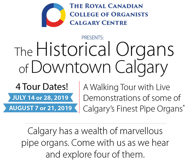 A Walking Tour with Live Demonstrations of some of Calgary’s Finest Pipe Organs Featuring the organs of Central United, Knox United, Cathedral Church of the Redeemer and Jack Singer Concert Hall! Sunday, July 14, 2019, 12:45 p.m. Sunday, July 28, 2019, 12:45 p.m. Wednesday, August 07, 2019, 11:15 a.m. Wednesday, August 21, 2019, 11:15 a.m.