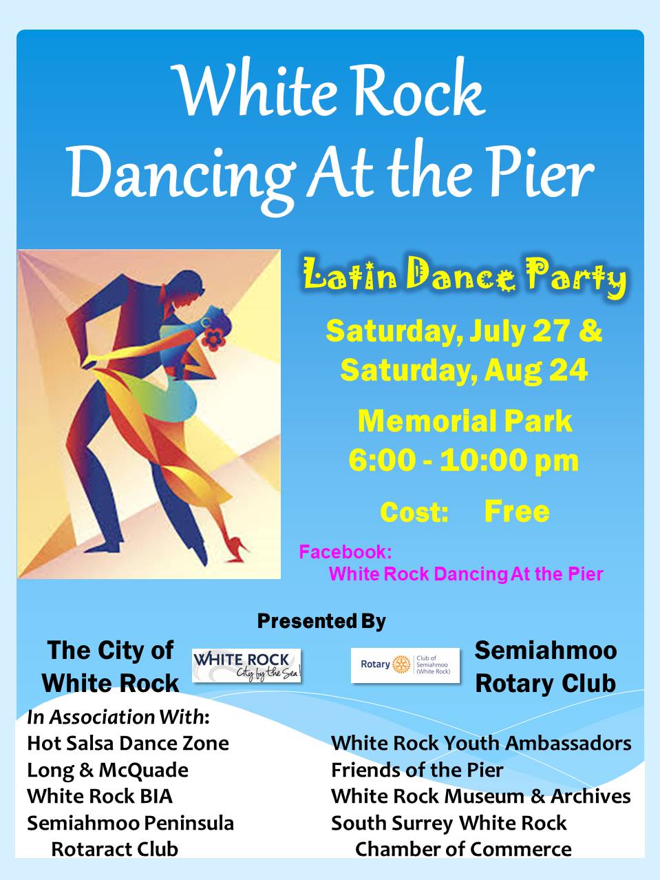 Come to White Rock and dance by the ocean! Spend the day at the beach, have an early dinner at one of the fine restaurants along Marine Drive, and then dance into the night with time for a late night dessert before heading home. White Rock Dancing At the Pier 2019, will be holding two (July 27 and August 24) lively Latin-themed events held at the new Memorial Park located on Marine Drive in White Rock beside the White Rock Museum and Archives (14970 Marine Dr, White Rock). White Rock Dancing At the Pier are free community building, all ages, non-profit events with a fund raising component. In 2019, White Rock Dancing At the Pier will be working with Friends Of the Pier. White Rock Dancing At the Pier is being presented by City of White Rock and the Semiahmoo Rotary Club and has support from local non-profit organizations and businesses on the Peninsula. Event Agenda The evening will begin at 6 p.m. with a free mini dance lesson then social dancing with performances at 8 p.m. by local and Lower Mainland dancers. After the performances, social dancing will resume and end at 10 p.m., leaving enough time to go for a dessert at a local restaurant before heading home. Latin music is lively and festive, can be danced individually or as partners, is entertaining to watch and will include salsa, merengue, bachata, cha cha, cumbia, and some reggaeton. There will be water sales and a bag check areas, but participants are encouraged to bring a reusable water bottle to help minimize single-use plastics and protect our oceans. The vision for White Rock Dancing At the Pier is that it will become an annual summertime event providing a fun, inclusive, healthy outdoor gathering in the White Rock area. Besides being community events, they will also have a fund/awareness raising component that will highlight the outstanding work local non-profit and charitable organizations do within and for the community.