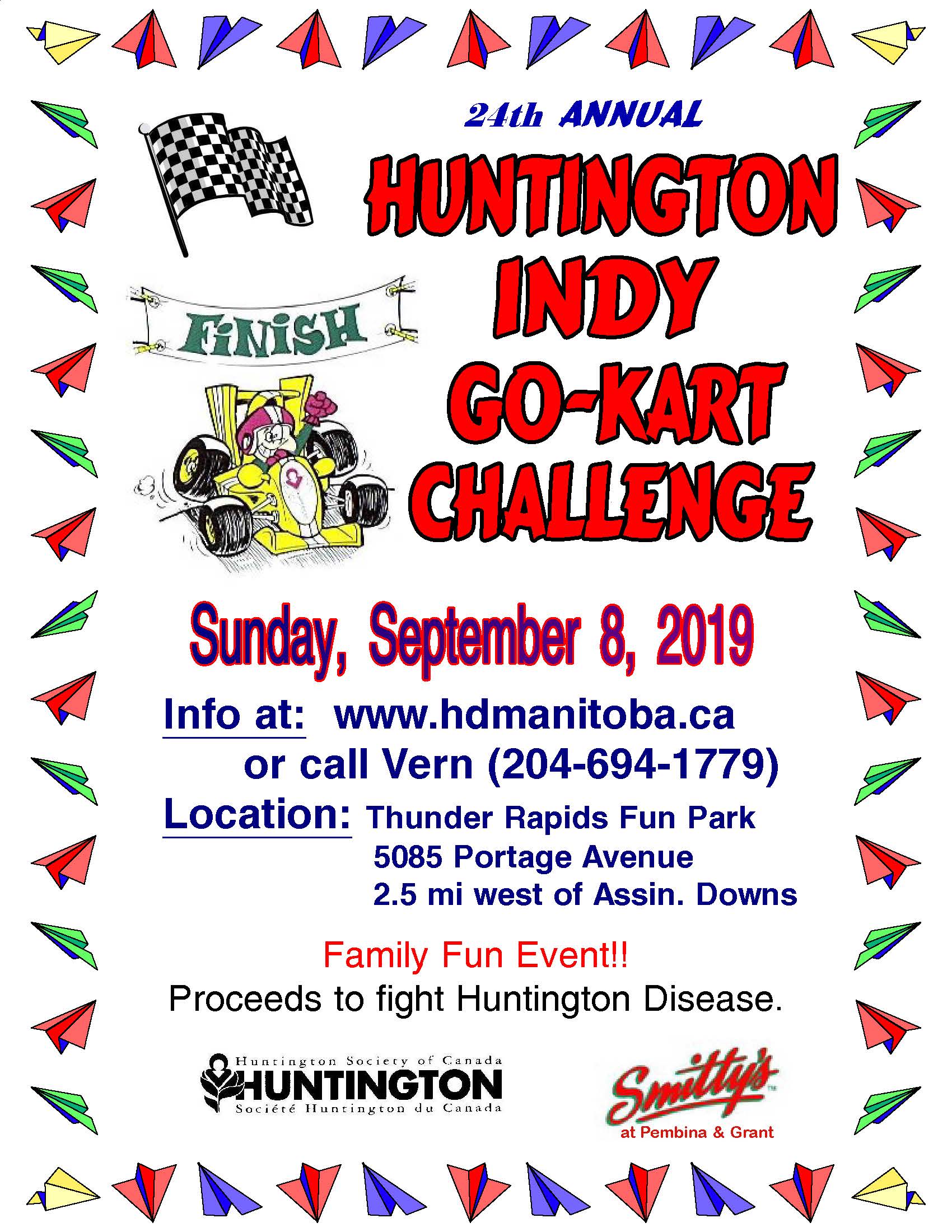 Sunday, September 8, 2019, 9am – 1pm CDT Location Thunder Rapids Fun Park, 5058 Portage Avenue, Headingley, MB Map Cities/Towns Winnipeg Type of Event Fundraiser Fun-filled family event! Teams “race” against each other in a relay-type event. Teams are a maximum of 6 people, and they “race” in a relay-type event. First driver for each team take his/her place in the pit area. First heat begins and after 20 minutes all karts come into the pit area, second drivers take their places, and the second heat starts. Process continues for 6 drivers (6×20 = 120 minutes/ 2 hours) of driving time. See http://www.hscevents.ca/WinnipegIndy. Team registration is $360, individuals can also register for $60 each and we will place on a team. We have “races” at 9 am and 11 am, so teams need to register by calling 204-694-1779 or email at info@hdmanitoba.ca. Kids must be 10 years old and 52″ tall to drive, but can be in a buddy kart. All info is on the brochure, but contact us if you have questions. Thanks so much!!!