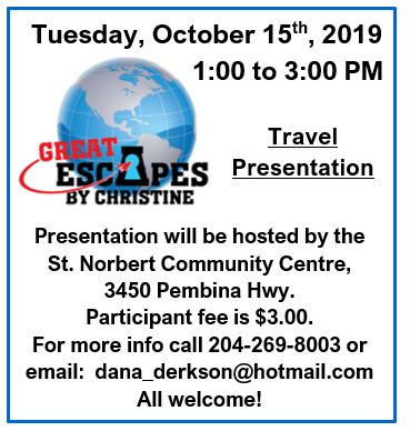 Join us on Tuesday, October 15th for Great Escapes by Christine Travel Presentation from 1:00 to 3:00 PM. This Event will be hosted by St. Norbert Community Centre, located at 3450 Pembina Highway. For more info contact Dana at 204-269-8003 or dana_derkson@hotmail.com. Participant fee $3.00.