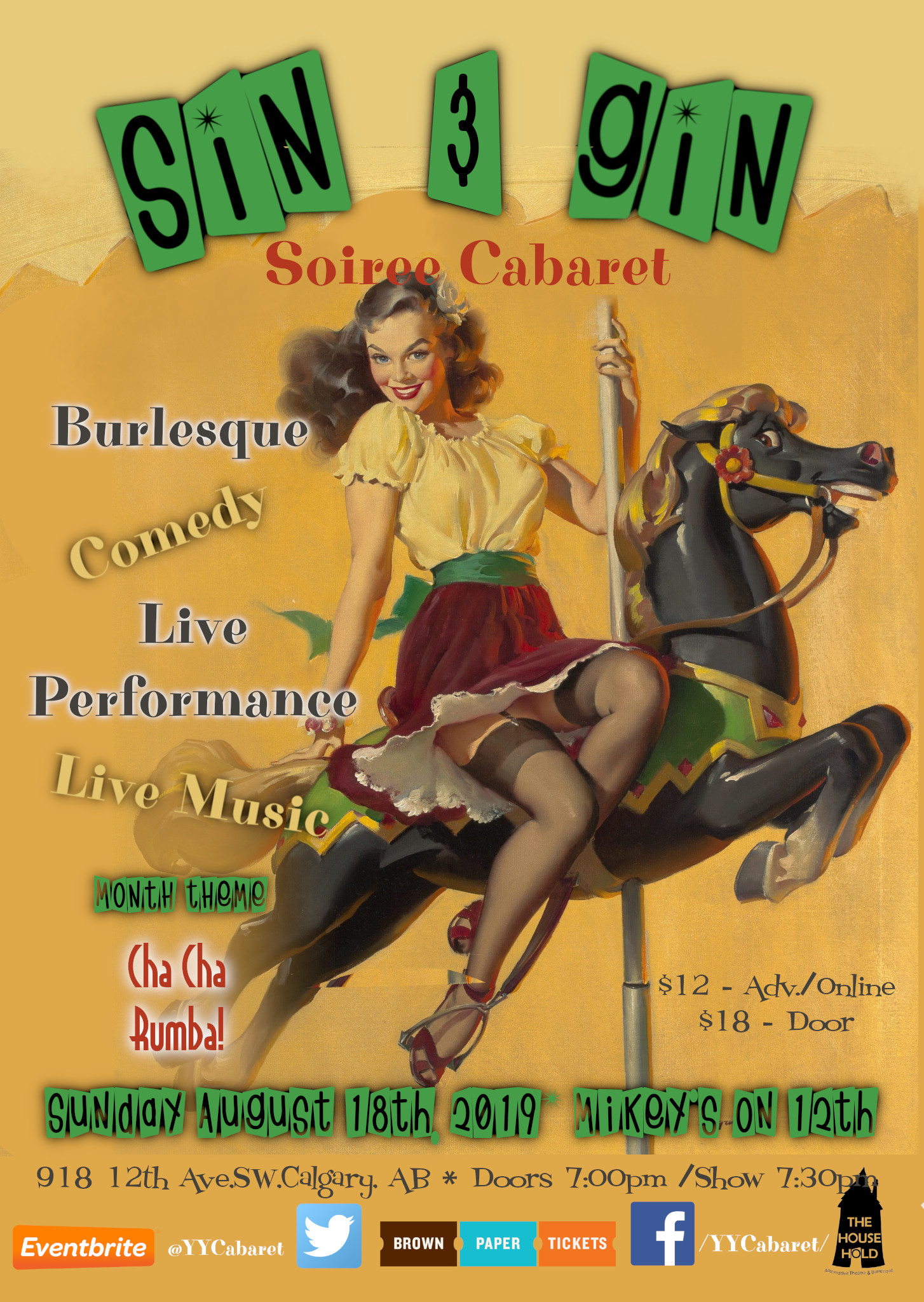 Sin & Gin is filled with Music, Comedy, Burlesque, Dance, Cabaret and more! This month we are celebrating the hottest month of the year, and no better way than to ‘Cha Cha Rumba!’ it! This is a perfect evening for your event – Birthdays, Anniversaries, Bachelor/Bachelorettes, and anything that you want to do to take a break and escape. Be ready to partake of the amazing talent that Canada & Calgary has to offer. Book online to reserve your front seat! Or dare to take a chance at the door! Stay tuned to the event page as we share with you who else is sharing the Sin & Gin – ‘Cha Cha Rumba!’ Sunday August 18th, 2019 – Mikey’s on 12th, 918 12th Ave Sw, Calgary AB Show 7:30 – 9:30pm Tickets: $12 adv -Mikey’s on 12th or online – $18 – cash @ door