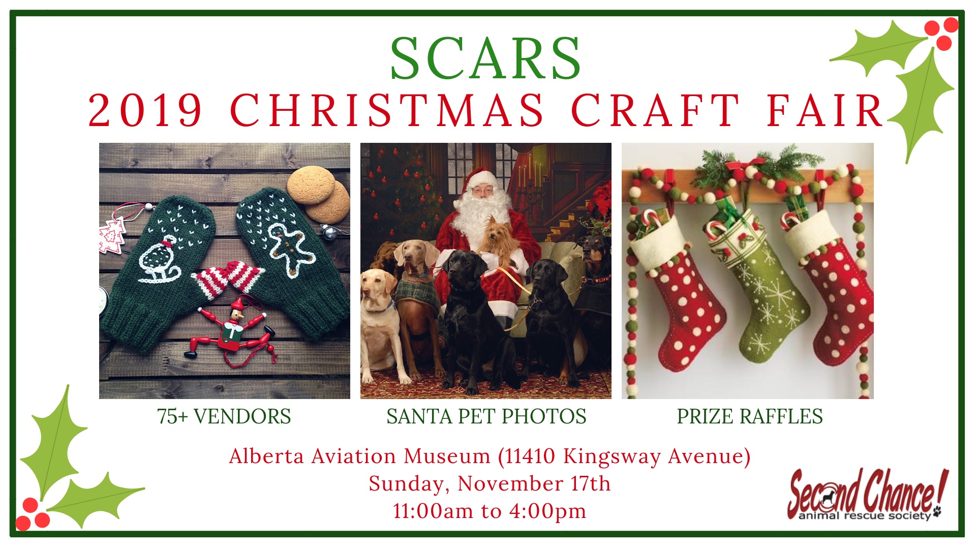 A unique market in support of the Second Chance Animal Rescue Society featuring 80 local, small businesses with handmade items. The event is pet friendly and will offer pet & family photos with Santa, 50/50 draw, prize raffles and a meet & greet with rescued animals who are looking for a home to call their own.