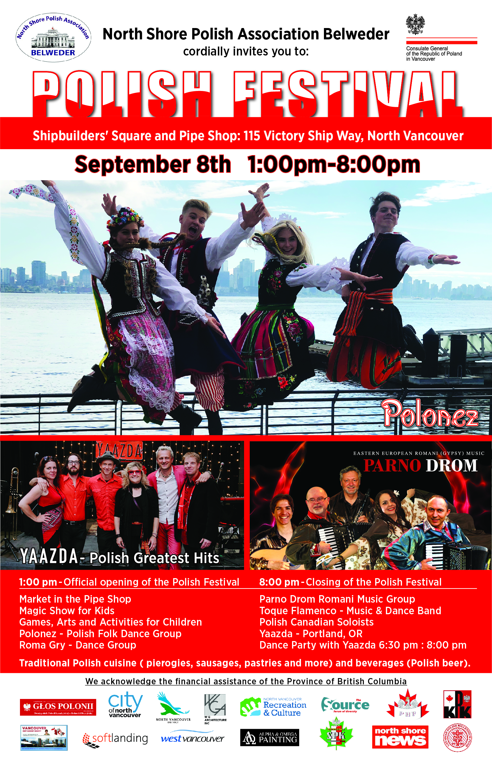 The 7th annual Polish Cultural Festival at the Shipbuilders’ Square and the Pipe Shop in Lower Lonsdale will feature Polish music, singing and folk dancing and a special program for children and youth with, arts and games activities, sing along and more. For kids, Gina-Marie Frazier from Castletop Characters will be performing face painting, balloon twisting and a 30 min magic show! Performances from Polonez – Polish Canadian Dance Society the dance group from Vancouver. Vendors will be selling Polish T-shirts and accessories, jewelry, arts and crafts, as well as plenty of delicious traditional Polish food such as sausages, perogis and pastries. Come have fun at the Polish Festival! Celebrate with your family and friends and meet others in the community. Festival hours 1:00 pm – 8:00 pm Dance Party with YAAZDA from 6:30 pm to 8:00 pm Free admission.