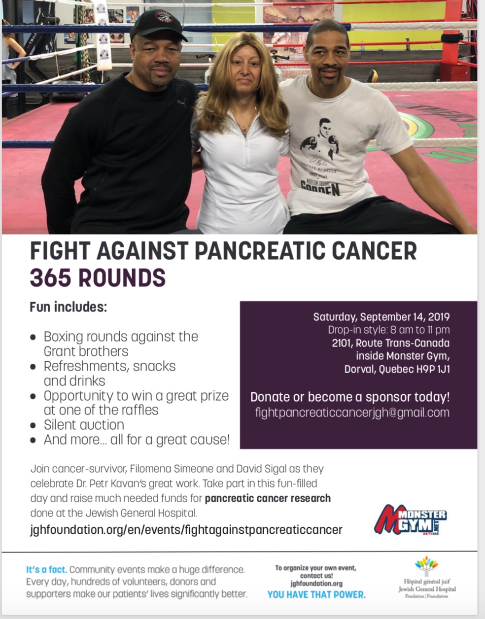 Join cancer-survivor Filomena Simeone and David Sigal for a fun-filled day of boxing and so much more on Saturday, September 14th, 2019, at Monster Gym, raising important funds for pancreatic cancer research at the Jewish General Hospital in appreciation of Dr. Petr Kavan. The fun includes: • Boxing rounds against the Grant Brothers and professional trainers • Refreshments, snacks and drinks • Opportunity to win a great prize at one of the raffles • Silent auction • Karaoke • And more, all for a great cause! Read cancer survivors full story here: https://jghfoundation.crowdchange.co/8986