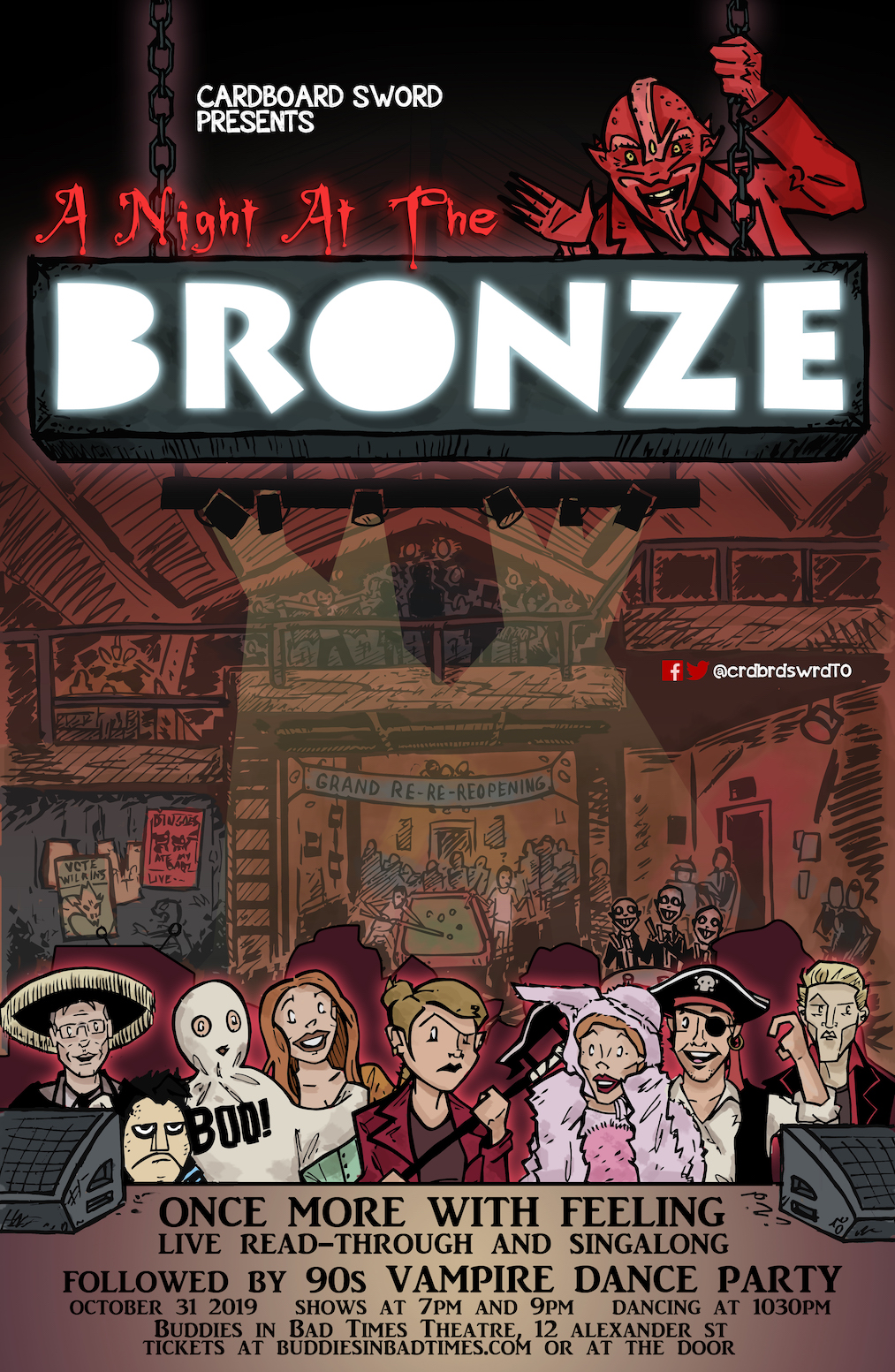 Back for a 3rd year in a row! By popular demand (and cause this event always sells out!) we are doing TWO shows! 7:00 & 9:00pm, followed by an all night 90s Dance party at everyone’s favourite teen hangout – The Bronze! Calling all Buffy fans and theatre lovers alike! Join us on All Hallows Eve as we do a live read through of one of Joss Whedon’s most beloved episodes of his most beloved show! A cast of comedians and actors read and sing-through the entire episode of Once More With Feeling. Want to join in? Absolutely! Lyrics will be provided so “you can sing along”! Join us for this fun-filled, satirical performance of the cult classic! Starting at 10:00pm, Buddies in Bad Times transforms into The Bronze – everyone’s favourite iconic 90s bar! Dance the night away with all your favourite Scoobies to all the 90s classics spun by DJ Xander. Walk through the fire with us! Buddies In Bad Times Theatre TWO SHOWS followed by a dance party at The Bronze! October 31st – 7:00pm + 9:00pm Can’t make the show but want to dance? Join us after for a Buffy Tribute Night: https://www.facebook.com/events/1310831869074599/ Cast Buffy, the slayer: Jenna Warriner (CMT’s Hottest) Willow, a witch: Liz Johnston (Entrances and Exits) Tara, a witch: Kaitlin Morrow (Sex T-Rex) Anya, an ex-demon: Stephanie Malek (Songbuster) Xander, Anya’s fiance: Mark Andrada (Cannibal The Musical) Giles, Buffy’s watcher: Ian MacIntyre (The Beaverton) Dawn, Buffy’s sister: Nkasi Ogbonnah (Second City House Co.) Spike, a vampire: Kyah Green (Second City House Co.) Sweet, a toe-tapping demon: Conor Bradbury (Sex T-Rex) Everyone else in the show/Ensemble: Emilio Andrew Vieira (Shakespeare in High Park), Jillian Welsh (Second City Touring Company), Jenny Pullon (The Wedding Singer), and Ophira Calof (Generally Hospital) Musical Directors: Jordan Armstrong (Second City) and Tai Wong-Clayton (The Ballad of Stompin Tom)
