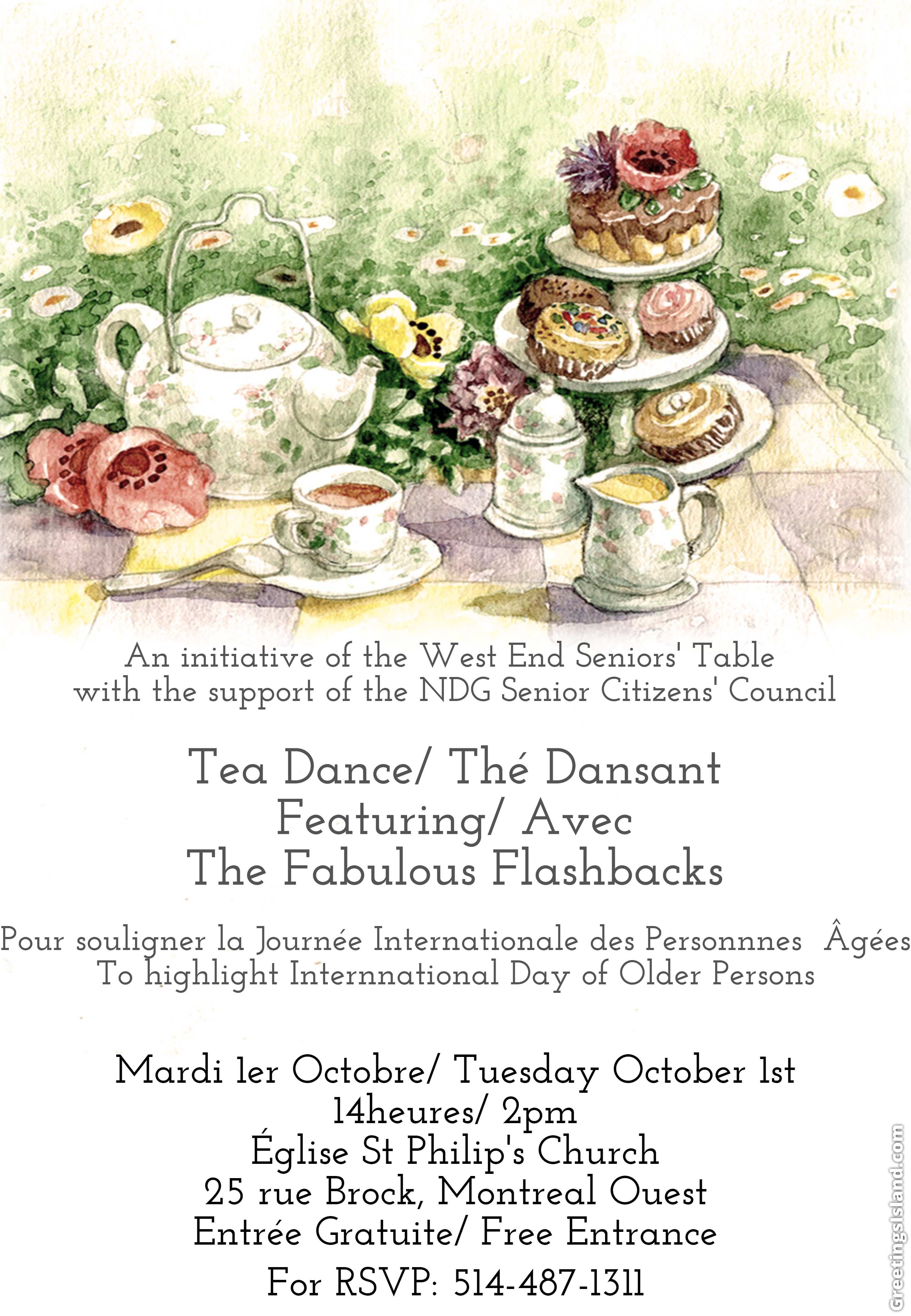 Please post the following An initiative of the West End Seniors’ Table with the support of the NDG Senior Citizens’ Council Tea and Dance With a live band The Fabulous Flashbacks To highlight International Day of Older Persons Tuesday October 1st 2:00 p.m. St. Philip’s Church 25 Brock Montreal West Free EVERYBODY IS WELCOME Many thanks, Anne Mackay NDGSCC
