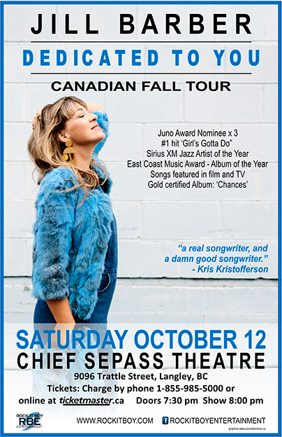 From your stories and memories JILL BARBER DEDICATED TO YOU TOUR Saturday, October 12 at the Chief Sepass Theatre, 9096 Trattle Street, Fort Langley. Tickets are $35.00 (Plus Facility Fee & Service Charges) at all Ticketmaster locations. Charge by phone at 1-855-955-5000 or online at http://www.ticketmaster.ca.