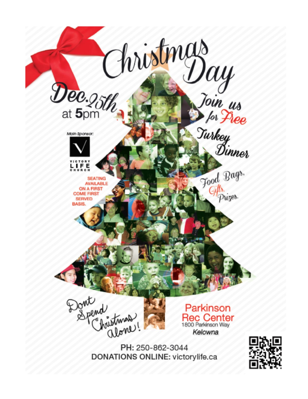 NO ONE SHOULD SPEND CHRISTMAS ALONE On December 25th from 5 to 7 pm Victory Life will host the 16th Annual FREE Christmas Day Dinner FREE Turkey Dinner Food Gift Bags Gifts for Children & Youth Prizes Entertainment & Fun! NO Registration Required To donate: victorylife.ca/donate or mail in To volunteer: victorylife.ca or 250-862-3044 YOU CAN MAKE A DIFFERENCE!