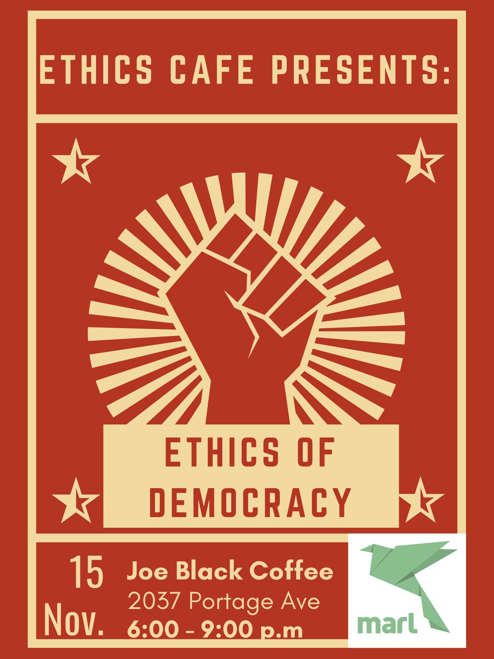 The Manitoba Association for Rights & Liberties presents its Ethics Café series at Joe Black Coffee Bar (2037 Portage Ave.) Open to everybody, The Ethics Café is an inclusive community dialogue, asking you to join the discussion on today’s most difficult questions. No answer prep is necessary, and how you choose to participate in the discussion is up to you! This time, we’ll be discussing the Ethics of Democracy. What is democracy, how is it defined? What are the rules of democracy? These, and more, may be some of the challenging questions we tackle at this discussion in a fun and friendly setting. Doors open at 6PM, Discussion begins at 7PM. Entry by donation to MARL, though no one will be turned away due to lack of funds. Our Community Expert facilitating the discussion will be professor Neil McArthur. Thanks to our event partner, the University of Manitoba Centre for Applied and Professional Ethics for their continued partnership.