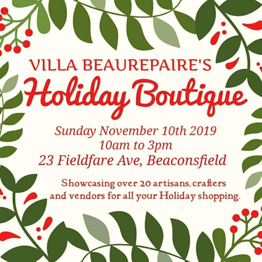 This event will be held at both Villa Beaurepaire & Beaurepaire Church at 23 Fieldfare, Beaconsfield from 10am to 3pm Will we have a wide variety of artisans, crafters and vendors for you to come and shop with for your holiday gift giving needs. Jewellery, soap, knitted and crocheted items, baked goods and so much more!!! Free entry. 1st 100 guests receive one of “Thank you” bags. Looking forward to seeing you there.