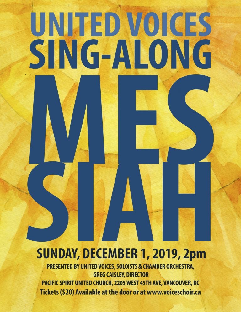 Please join United Voices Choir, Soloists and Chamber Orchestra for our 2nd annual Sing-Along Messiah Dec 1 @ 2 pm at Pacific Spirit United Church in Vancouver. Music scores and Christmas goodies provided. $20 at door or online.