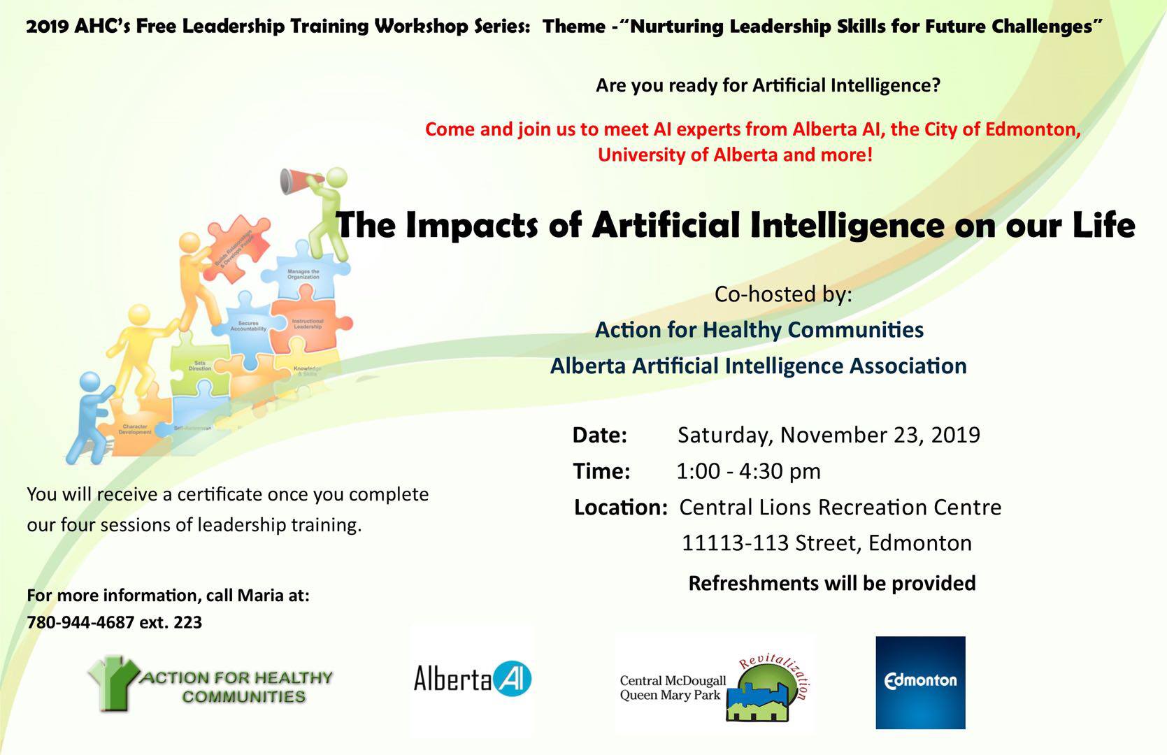 Join us on Saturday, November 23rd for the first-of-its-kind free leadership training workshop on The Impacts of Artificial Intelligence on our Life”. This workshop is co-hosted by Alberta Artificial Intelligence Association and sponsored by the City of Edmonton.