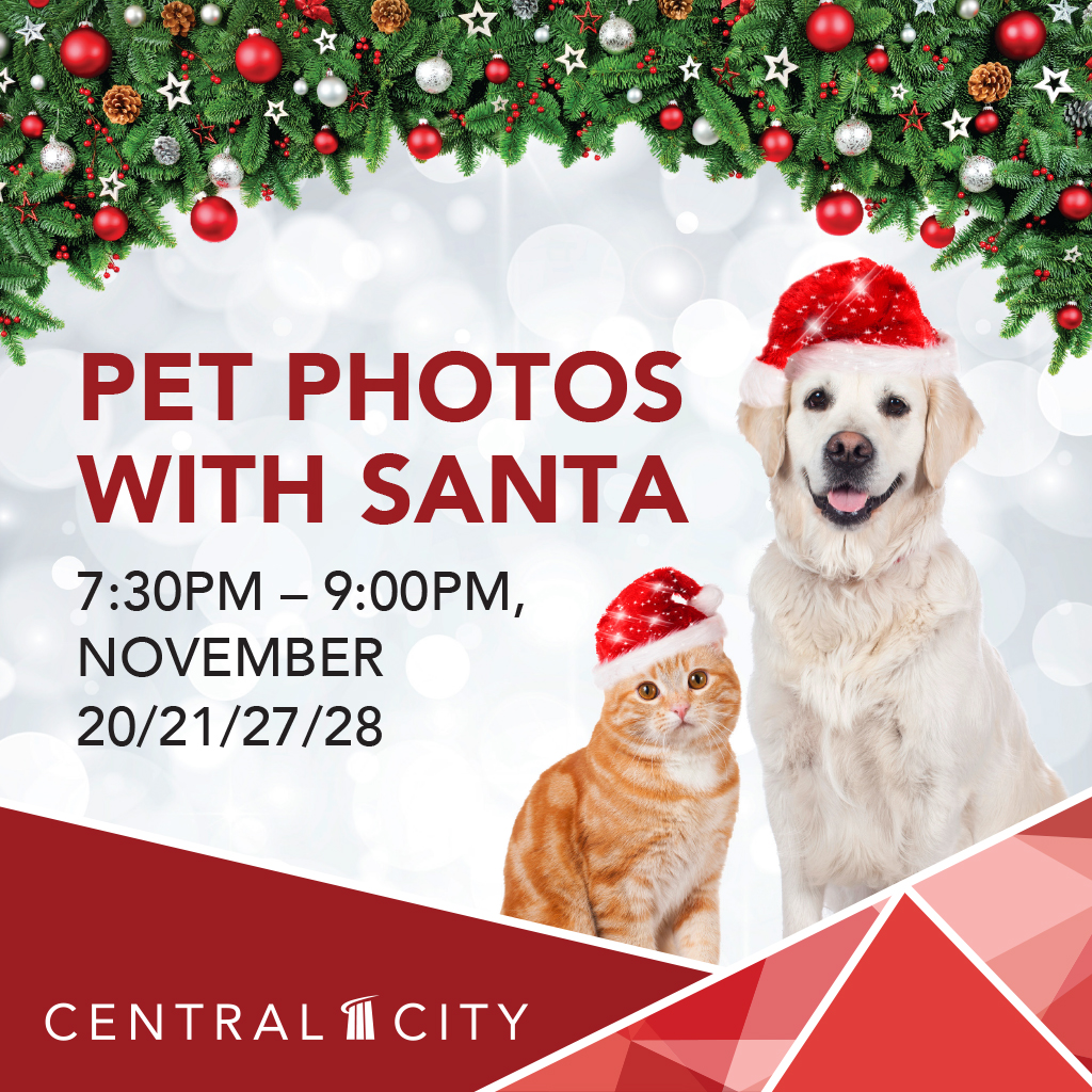 Get your favourite furry friend’s photo taken with Santa this holiday season at exclusive pet photo sessions at Central City! Cat and dog photos take place at Santa Land on the southwest side of the shopping centre (adjacent to Tim Hortons) from 7:30pm to 9:00pm November 20, 21, 27, and 28. Visit http://www.centralcity.ca for more details.