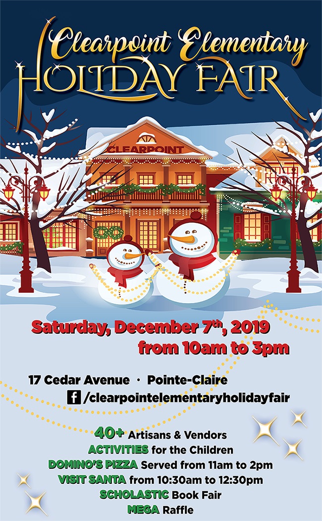 We are so very excited to see you, your family and friends at our fair being held Saturday, December 7th from 10:00 AM to 3:00 PM, at Clearpoint Elementary School (17 Cedar Avenue, Pointe-Claire). At our fair, you will find art, baked goods, clothing, comics, crafts, jewelry, pet treats and accessories, preserves, raffles, refreshments, soaps, toys and much more! 40+ wonderful artisans and vendors including some first timers to our fair and many familiar favorites, as well as our Scholastic Book Fair. Plenty of activities for the children such as the Kids Spa, Kids Only Room, ornament decorating, cookie decorating, jewelry making, Xbox/PlayStation/Wii room, and the Grade 6 Game Room! Please come hungry to the fair! Aside from having our Chili Off and refreshments, Domino’s Pizza (Pointe-Claire) will be there serving fresh, hot pizza from 11:00 AM to 2:00 PM. Slices are $2.00 each and $1.00 per slice is being donated to Clearpoint from Domino’s Pizza! Need a little pick me up the day of our Holiday Fair? Come and enjoy a nice cup of hot coffee (donated by Bien Manger). Visit Santa Claus from 10:30 AM to 12:30 PM! Come meet the Beat Squad members from The Beat 92.5 FM as they play music and hand out Beat swag! We look so very forward to seeing you all!!!