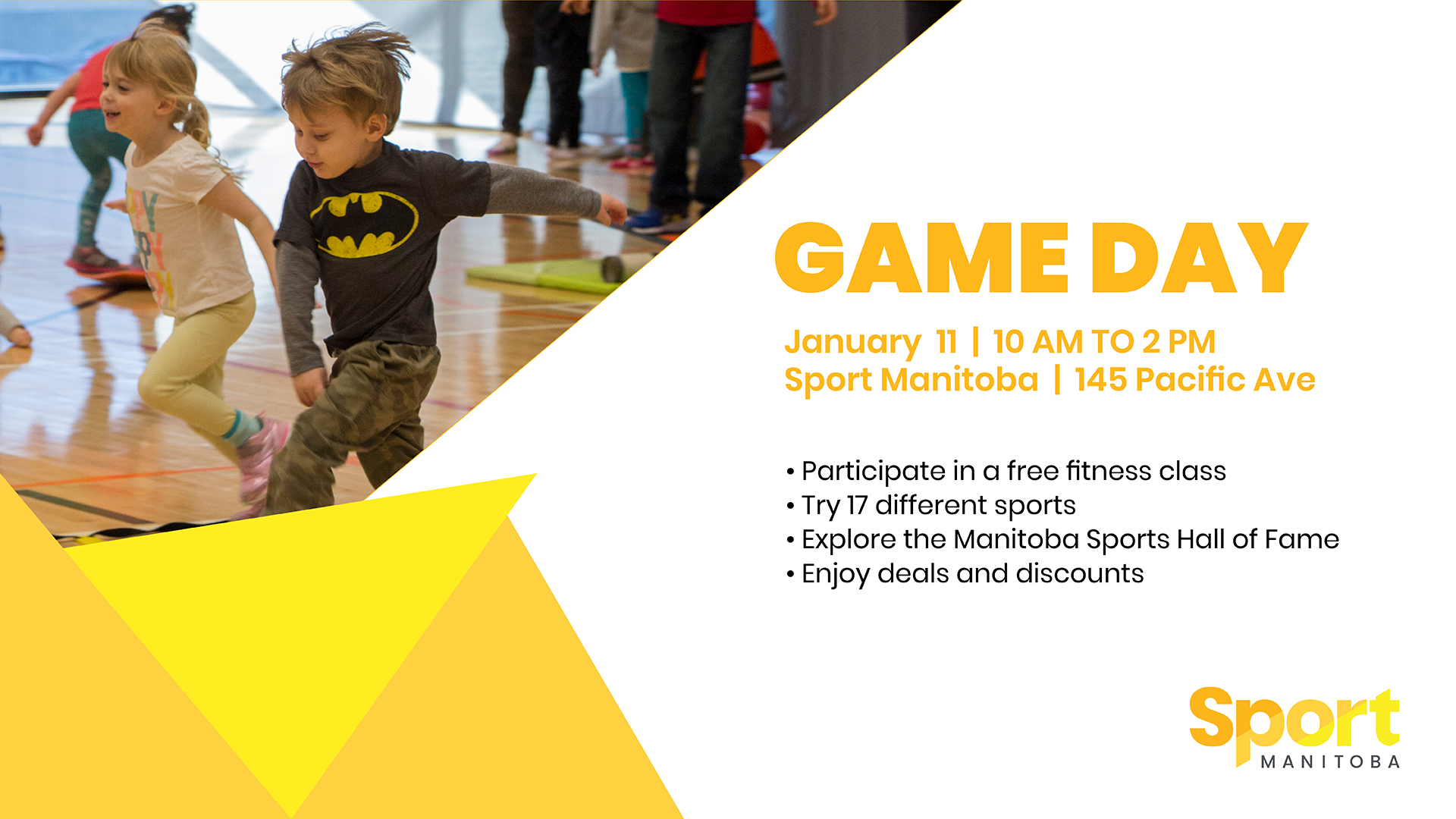Join us on January 11, 2020 from 10 a.m. to 2 p.m. for Sport Manitoba’s second annual Game Day. This is an opportunity for you and your family to try out 17 different sports, participate in one of our fitness classes, tour the building, and explore the Manitoba Sports Hall of Fame all for free. On top of that, you’ll receive 10% off a fitness centre membership or personal training package. Find us at 145 Pacific Ave or sportmanitoba.ca. Sport Manitoba is the province’s leading planning, programming, and funding agency for amateur sport. Our building on 145 Pacific Avenue has a gymnasium, a fitness centre, a sport medicine clinic, and offers professional athlete training.