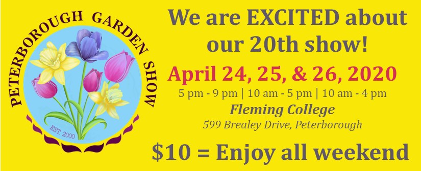 The Peterborough Garden Show will be back for its 20th year: April 24 – 26, 2020 (Friday 5-9pm, Saturday 10am-5pm & Sunday 10am-4pm). And we have great news ! We’re returning to Fleming College with lots of FREE parking and a $10, one-price ticket so you can enjoy the show all weekend. We will have two entrances this year; closer parking and more space. Two shuttle buses and bus drop-off right at the door. – Speakers include Alexander Reford (Reford Gardens); Sean James (Rain Gardens): Carlotta James (the Monarch Ultra) Thom Luloff (Critters in the Garden) and others TBA… – Lunch with Alexander Reford in Fleming’s on site restaurant – Workshops on pruning, flowers, splitting plants, orchids, ponds, bugs and butterflies and still more. – Films and videos: inspiring to all gardeners. – The Children’s Garden: the most popular space for kids and grownups. – Vendors! Around 100 offering almost everything garden-related that you can think of This award-winning show was honoured in 2017 with both a “Canada 150 Garden Experience”, and “Garden Event of the Year” by the Canadian Garden Council. Come see what all the fuss is about. Note: Show profits give back to our community (over $200,000 since 2002): scholarships for students studying horticulture & the environment and supporting local Community Gardens. This award-winning show is run by volunteers from the Peterborough Horticultural Society and our gardening community. See peterboroughgardenshow.com for tickets, places to stay and more details.