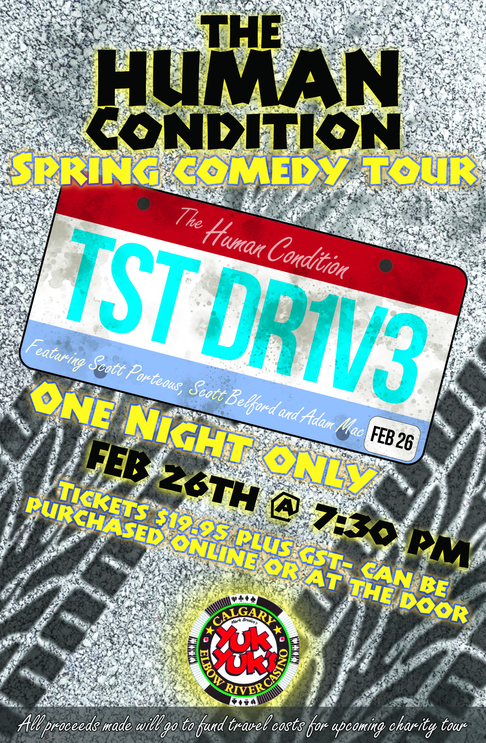 After a very successful run last September The Human Condition Comedy Tour are doing it again! This coming March three comedians (Scott Belford, Adam Mac and Scott Porteous) will be touring in Western Canada to raise awareness and funds for various different local charities. All proceeds made from Test Drive will help to cover all expenses like marketing, accommodations, food and gas. We hope you’re able to come out and not just support but enjoy yourself in what’s looking to be a fun night of laughter that will be for a good cause. Feb 26th Show starts at 7:30 Tickets are available through Yuks box office and can also be purchased online soon or at the door.