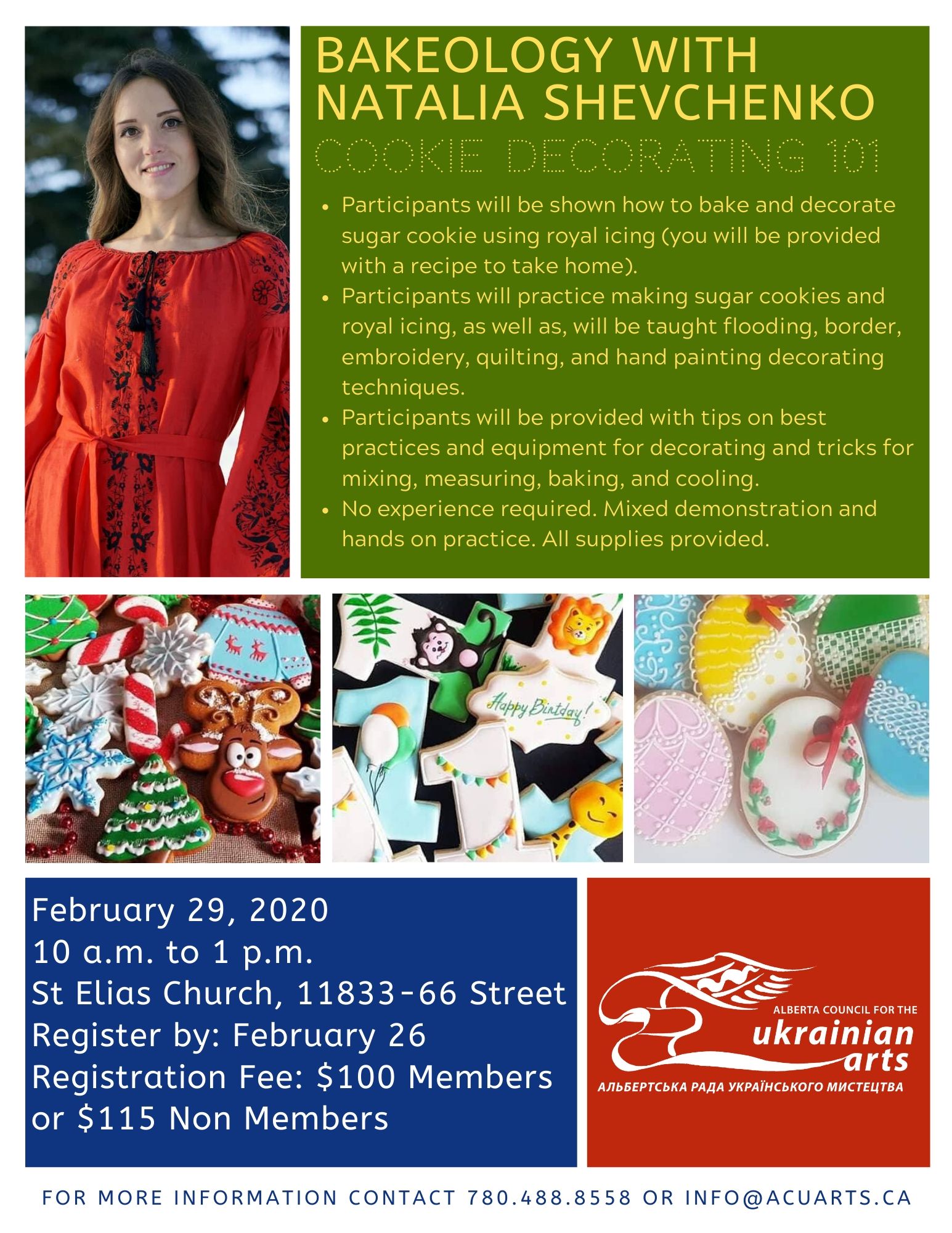 Participants will be shown how to bake and decorate sugar cookie using royal icing (you will be provided with a recipe to take home). Participants will practice making sugar cookies and royal icing, as well as, will be taught flooding, border, embroidery, quilting, and hand painting decorating techniques. Participants will be provided with tips on best practices and equipment for decorating and tricks for mixing, measuring, baking, and cooling. No experience required. Mixed demonstration and hands on practice. All supplies provided. Registration Fee: $100 Members or $115 Non Members Contact: info@acuarts.ca (780) 488-8558