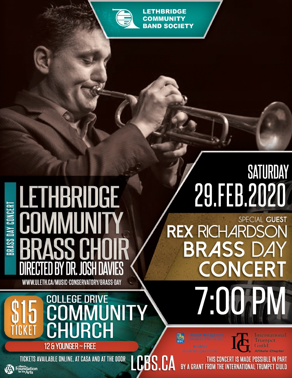 Join us on Saturday Feb. 29th, 2020 at 7pm at the College Drive Community Church, as the Lethbridge Community Brass Choir celebrates Brass Day! This concert will feature International Trumpet Soloist and Jazz Artist Rex Richardson. Hailed in classical circles as “among the very best trumpet soloists in the world today,” (International Trumpet Guild) and “One of the finest virtuosos of our time…boundless versatility…stunning,” (Brass Herald) and in jazz as “a standout soloist with the power, range and flexibility to rival Freddie Hubbard and Woody Shaw,” (DownBeat Magazine) Yamaha Performing Artist Rex Richardson was named the 2008 Brass Herald Personality of the Year. We are so honoured to have him perform with us for this incredible night of music! Be sure to get tickets before it’s sold out! Tickets are 15$ with children under 12 free, and are available starting January 20th at Casa and online at lcbs.yapsody.com. Tickets also available at the doors starting at 6:15pm the night of the performance.