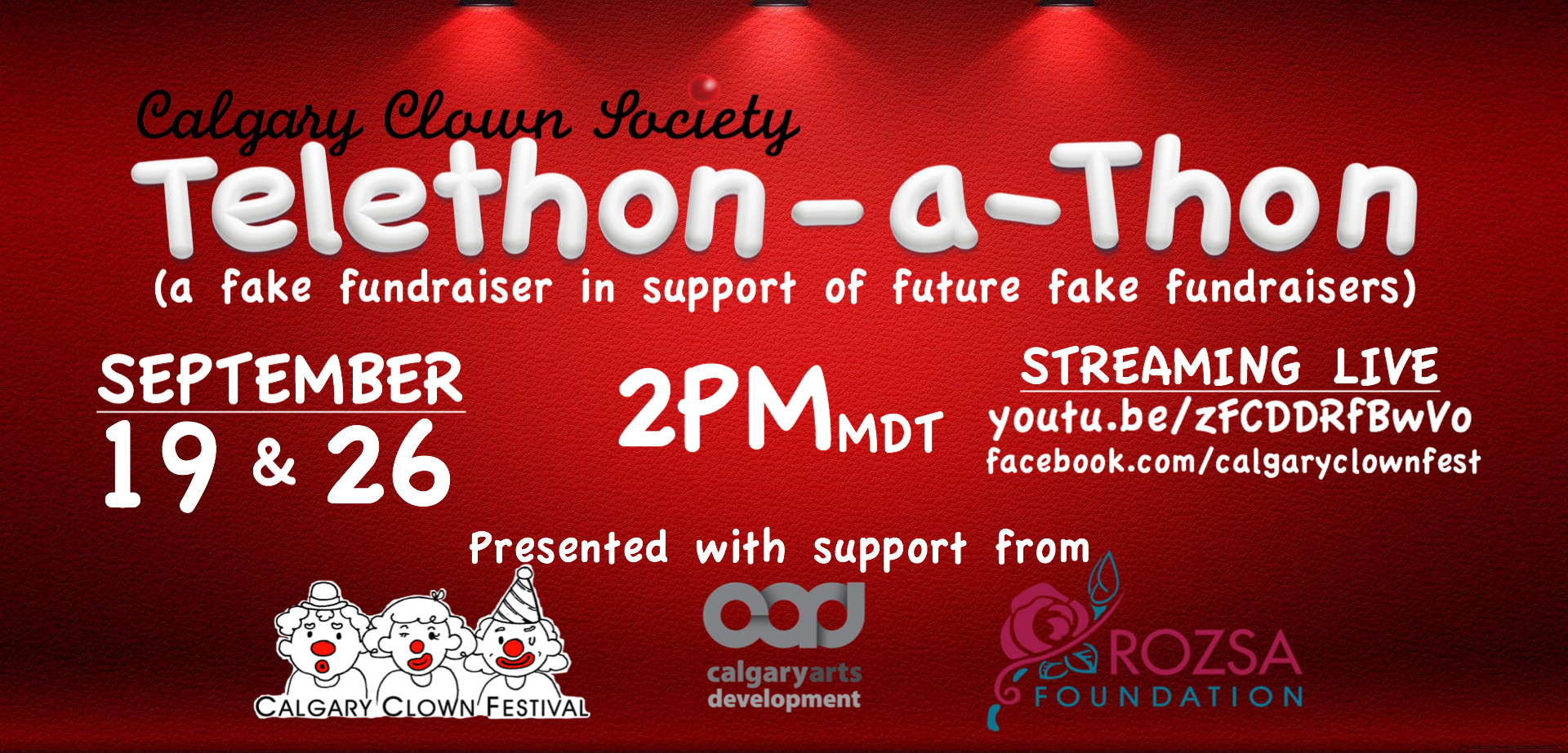 The Calgary Clown Society is pleased to present its first ever online, live-streamed show, “Telethon-a-thon!” Welcome to the world’s first fake fundraiser in support of future fake fundraisers. Featuring artists from around the world, including Jon Davison of the London Clown School in England and Deanna Fleysher known for her show, Butt Kapinski, Tele-thon-a-thon offers a backstage view of what it takes to get a group of clowns to put on a show! If you like SCTV and the Muppets then this is the show for you. With a headlining magic show and a fitness expert on hand, everything for the Tele-thon-a-Thon should be a success. But clowns are an unpredictable lot and may have their own agendas for the show. There is something everyone will enjoy in this 88th Annual Tele-thon-a-Thon. It’s ridiculous and fun and a dose of clownish medicine that we call use right now! Please do NOT donate to the Tele-thon-a-thon. These clowns need no encouragement… WARNING: This show contains content and language that is suitable for viewers 13+.