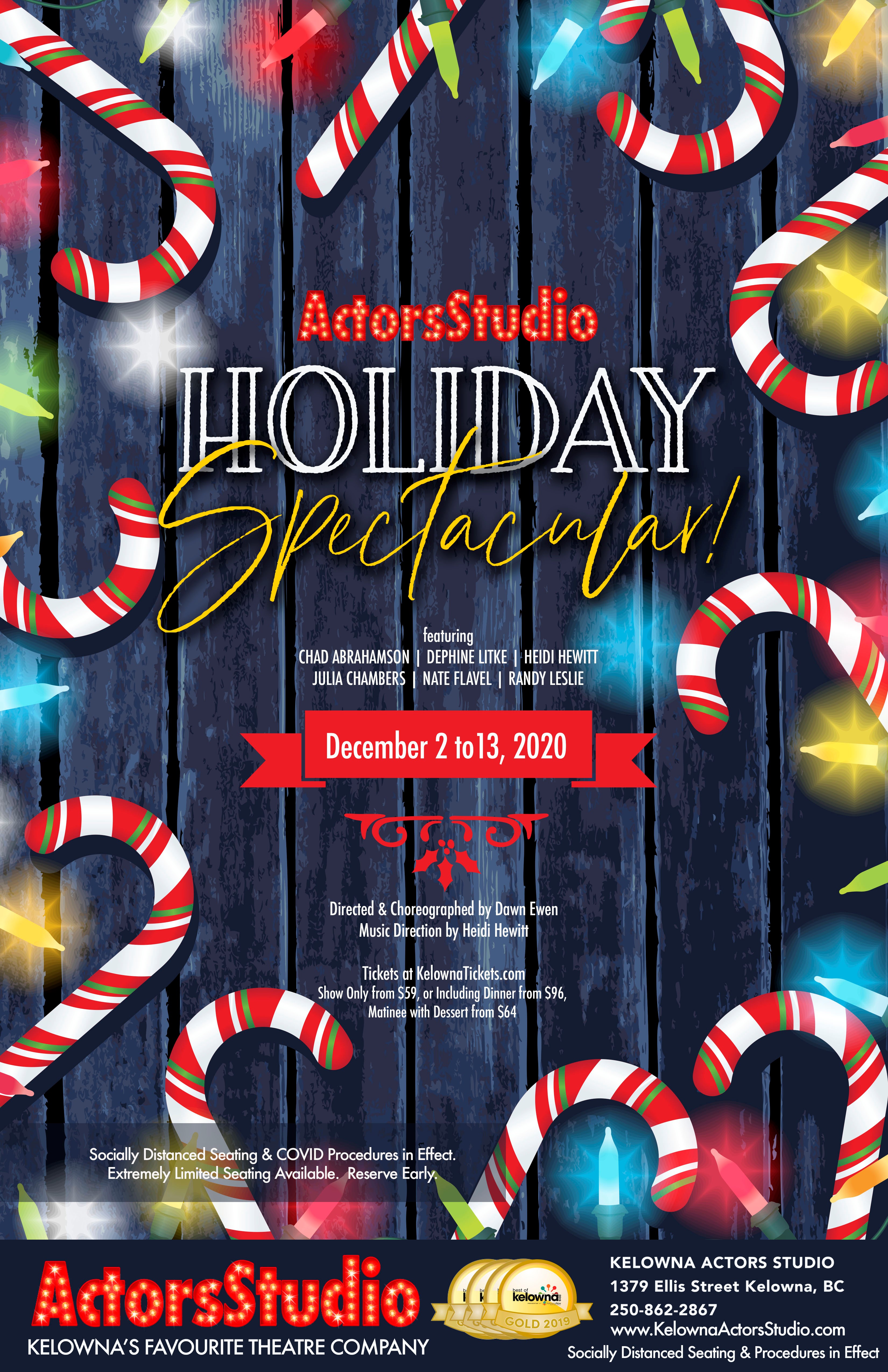 Kelowna Actors Studio is giving a special gift this holiday season: A Kelowna Actors Studio Holiday Spectacular, a new musical full of old classics, Christmas chestnuts, memories, laughs and Holiday spirit. Blending familiar songs and recordings with moments from television, movies and radio that have become part of our collective memories, the sounds, sights and themes that defined the holiday season for a century. With selections including: salutes to our favourite famous personalities, romantic holiday standards, animated specials, classic movies, and more, all presented in the format of a TV Holiday Special that used to be staples of the family winter experience. With comedy, music and mostly a lot of heart! In a two-hour reflection between the years of 1900 and now, the century that gave us the Radio City Music Hall Christmas Spectacular and Macy’s Parade, White Christmas and The Grinch. For children, it’s a chance to experience many of the cherished holiday moments their parents enjoyed. And for you grown-ups, it’s a season you’ll remember well. Where else can you get Scrooge, George Bailey, Rudolf and “Santa Baby” in one show, along with mistletoe and “carols ‘round the tree”? If you think you’ll need a boost this year to get in the holiday spirit, join Kelowna Actors Studio for a “new” show written by your KAS favourites Randy Leslie, Nathan Flavel and Artistic Producer, Dawn Ewen.