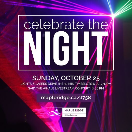 This year’s Celebrate the Night on October 25* will have two exciting features! The first is the Lights & Lasers Drive- In, and the second is a livestream concert with JUNO Award-winning trio, Said The Whale! Other activities include online games, a costume contest (taking place virtually) and The Great Pumpkin Recipe Challenge. mapleridge.ca/1758