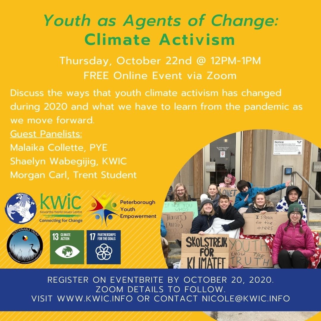 Join KWIC, Sustainable Trent, Peterborough Youth Empowerment (PYE) and panelists: Malaika Collette, Shaelyn Wabegijig, and Morgan Carl as we discuss the ways that climate activism has changed during 2020 and what we have to learn from the pandemic as we move forward towards effective and positive change. Panelists will share their unique experiences in activism and what steps they hope to see moving forward and invite you to join the conversation with questions, comments, and interactive participation.