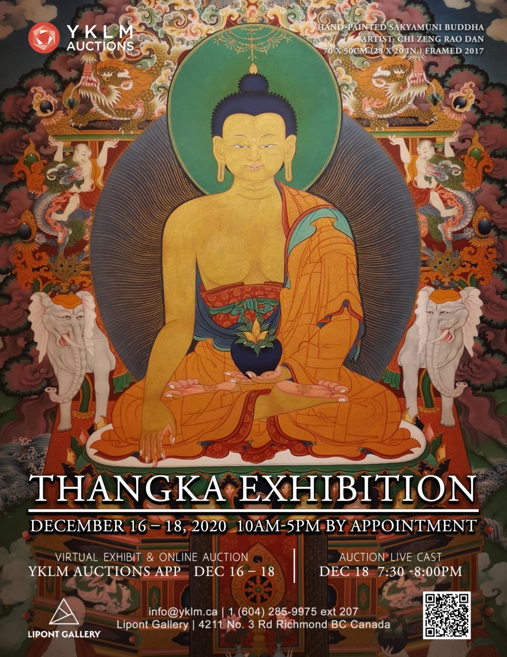 Tibetan Thangka Exhibition Lipont Gallery 4211 No. 3 Road Richmond BC V6X2C3 Dec 16 – 18, 2020 10am-5pm by appointment https://www.facebook.com/lipontgallery (604) 285-9975 info@lipont.com The exhibition features twenty-two exquisite Tibetan Thangkas created by Master Chi Zeng Rao Dan, Master Neng Ben Cai Rang, and Himalayan folk painters. The collection will be exhibited in its wholeness, which is a rare opportunity for Metro Vancouver audiences. The offline exhibition will take place from Dec 16 to 18 at Lipont Gallery. The virtual exhibition and online auction will start on Dec 16 on the YKLM Auctions mobile app. Lipont Gallery is representing the collection on behalf of collector Mr. Ga Rang Deng Zhen, who is a successful Chinese musician of Tibetan descent. He has been fervently researching and collecting Thangkas since 2000. Out of his love for Tibetan art and his expertise in his native Tibetan culture, he has built a deep bond with many contemporary Thangka masters, which gave him the opportunity to collect Thangkas of the highest quality. He is exhibiting the twenty-two Thangkas out of his precious collection to promote this ancient art, to form good ties with audiences and to sow the seed of good fortune. “Thangka is a colour scroll painted on cloth, leather or paper with gold, silver and natural gemstone mineral pigments, or embroidered on silk. Its style is not only different from oil paintings, but also different from traditional Chinese paintings. The composition is mainly based on plane perspective and focused on smooth lines and rich colours. Its rigorous process of making can be categorized as traditional Chinese gongbi style. The origin of Thangka can be traced back to the cave paintings of the Neolithic Age. Images like Thangka can be seen on the cave paintings found in Ali, Nagqu, Yushu, Qinghai and other places.” – text provided by the collector Media Contact: Patrick Li Pascal patrick.l.pascal@lipont.com (604) 285-9975 x 200 (778) 288-5108 Lipont Gallery https://www.facebook.com/lipontgallery https://twitter.com/lipontplace
